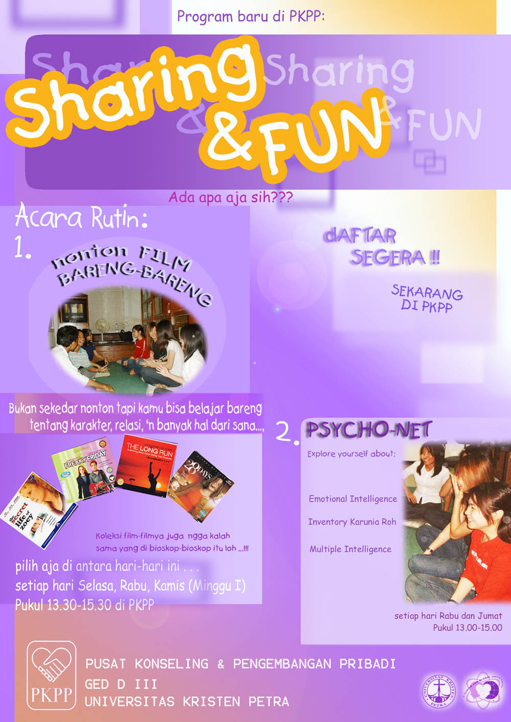 Poster Sharing & Fun ini dibuat dengan tujuan memperkenalkan program rutin Pusat Konseling dan Pengembangan Pribadi UK Petra yang tidak hanya untuk konseling, tetapi juga ada program pengembangan diri yang menyenangkan seperti nonton film sama-sama sambil belajar tentang karakter, relasi, dan lain-lain atau program psycho-net yaitu bagaimana kita dapat menggali diri kita sendiri seputar emosional intelligence, multiple intelligence, dan lain-lain.