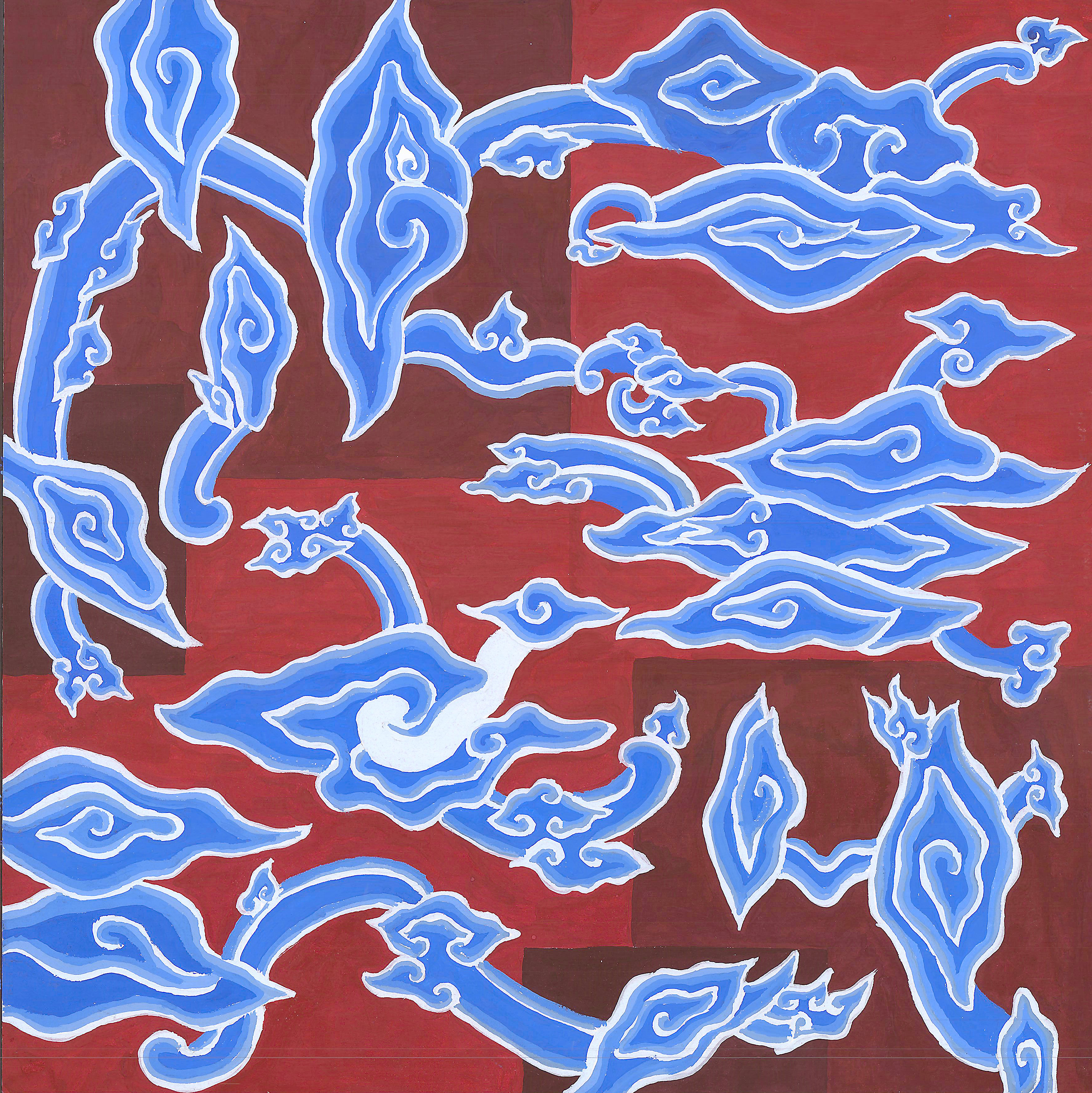 Bentuk awan dalam beragam budaya melambangkan dunia atas bilamana diambil dari faham Taoisme. Bentuk awan merupakan gambaran dunia luas, bebas dan mempunyai makna transidental (Ketuhanan). Unsur warna biru yang kita kenal melambangkan warna langit yang begitu luas, bersahabat dan tenang. Ditambah lagi dengan ada yang mengartikan bahwa biru melambangkan kesuburan sehingga warna batik Mega Mendung pada awalnya selalu memberikan unsur warna biru diselingi dengan warna dasar merah.
