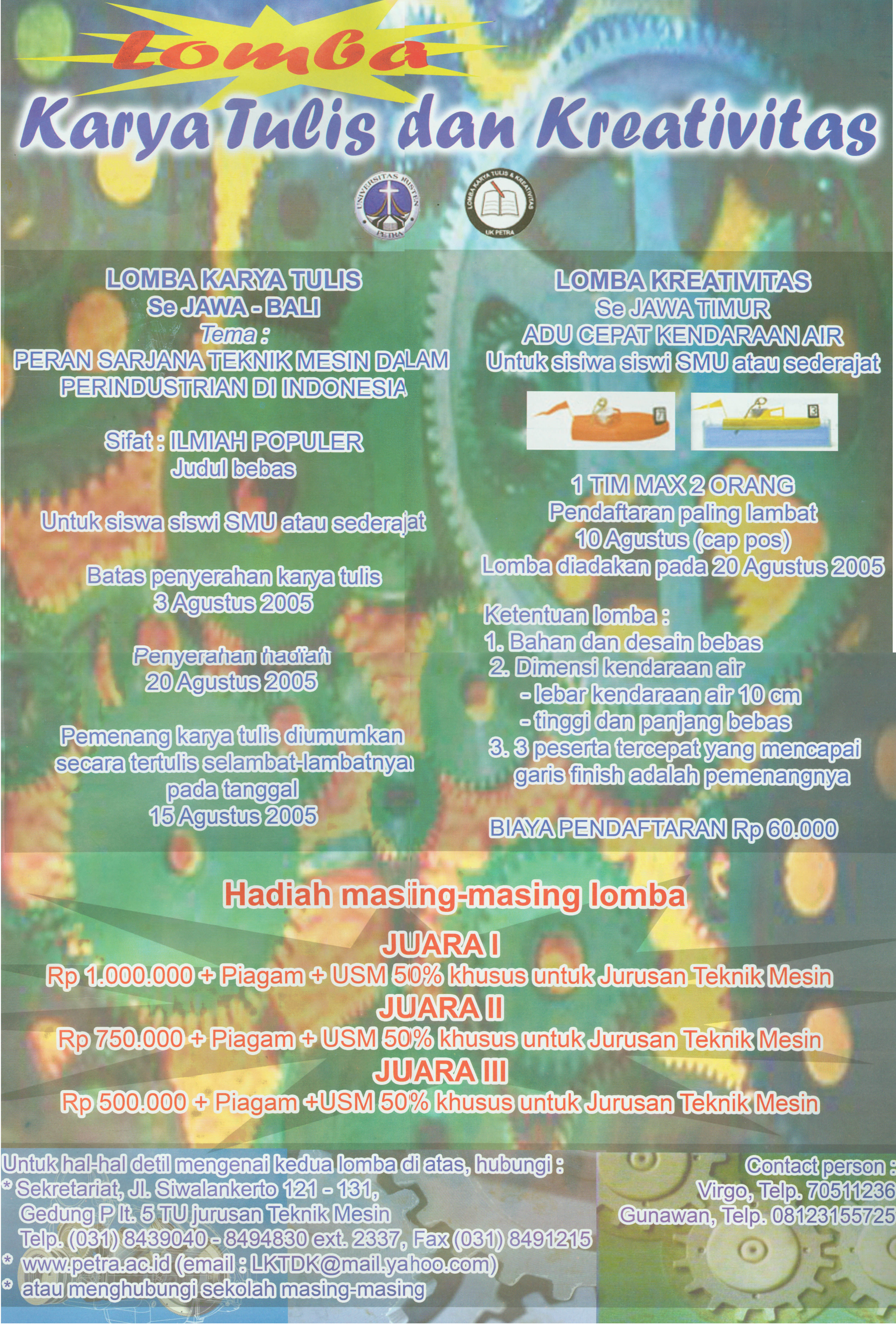 Lomba karya tulis se Jawa-Bali dan lomba kreativitas se Jawa Timur diselenggarakan oleh Jurusan Teknik Mesin Universitas Kristen Petra bertujuan untuk memperkenalkan jurusan teknik mesin dan mengembangkan kreativitas siswa SMU. Untuk lomba karya tulis tema yang diambil "Peran Sarjana Teknik Mesin dalam Perindustrian di Indonesia", sedangkan untuk lomba kreativitas: "Adu Cepat Kendaraan Air". Acara ini dilaksanakan pada bulan Agustus 2005.