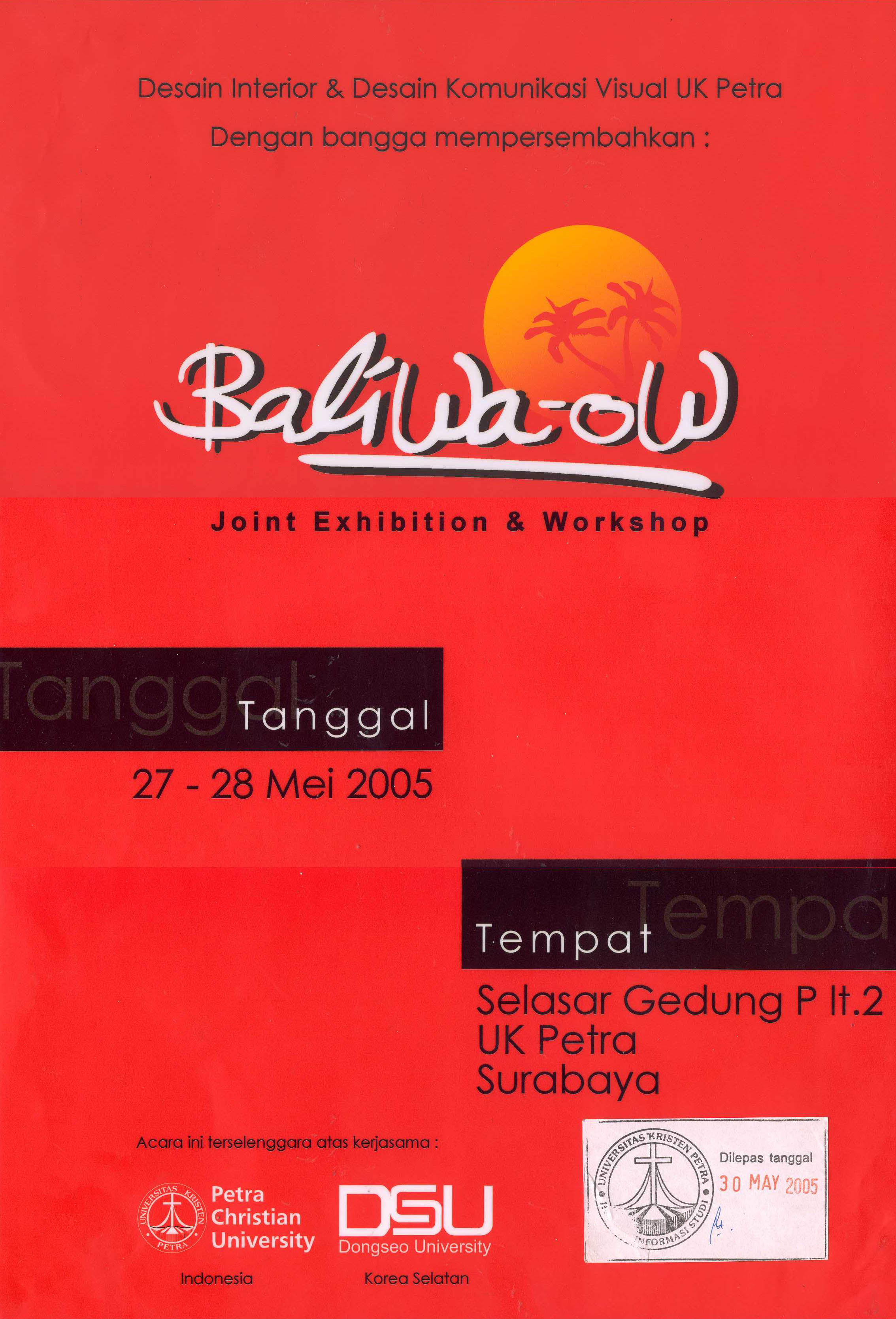 Poster dengan tema Baliwa-ow menyampaikan pesan akan adanya kegiatan pameran hasil karya mahasiswa dan dosen Desain Komunikasi Visual dan Desain Interior Universias Kristen Petra dan Universitas Dongseo Korea. Pameran ini bertempat di UK Petra sedangkan lokakarya (workshop) bertempat di Bali. Acara workshop dilakukan pada tanggal 23-26 Mei 2005, sedangkan acara pameran dilaksanakan pada tanggal 27-28 Mei 2005. Yang menarik dari poster ini adalah kata Baliwa-OW. Mengapa kata ini muncul karena diilhami oleh tempat lokakarya yaitu di Bali. "Baliwa" dalam bahasa Korea artinya cepat datang atau kemari kemudian kata ini diikuti oleh kata "OW" yang menyiratkan "Oh begitu indahnya Bali". Warna yang melatarbelakangi tulisan ini sengaja dipilih warna merah karena warna ini cepat tertangkap oleh mata dan terkesan pemberani. Dari sisi content pameran ini bertujuan mempromosikan jurusan Desain Komunikasi Visual dan Desain Interior, sedangkan lokakarya bertujuan agar mahasiswa DKV dan Desain Interior dapat membuat desain bersama atau redesign bahkan desain baru. Di samping itu diharapkan mahasiswa Universitas Kristen Petra bisa bertukar pengalaman dengan mahasiswa Universitas Dongseo Korea.