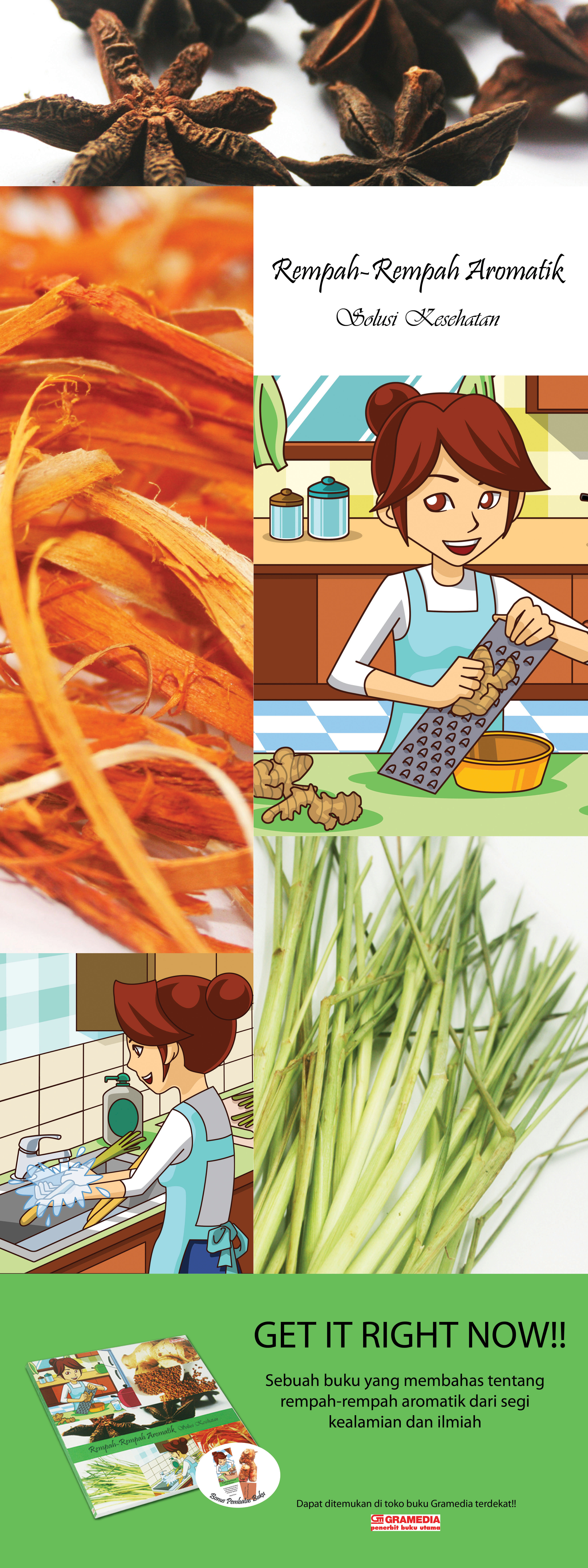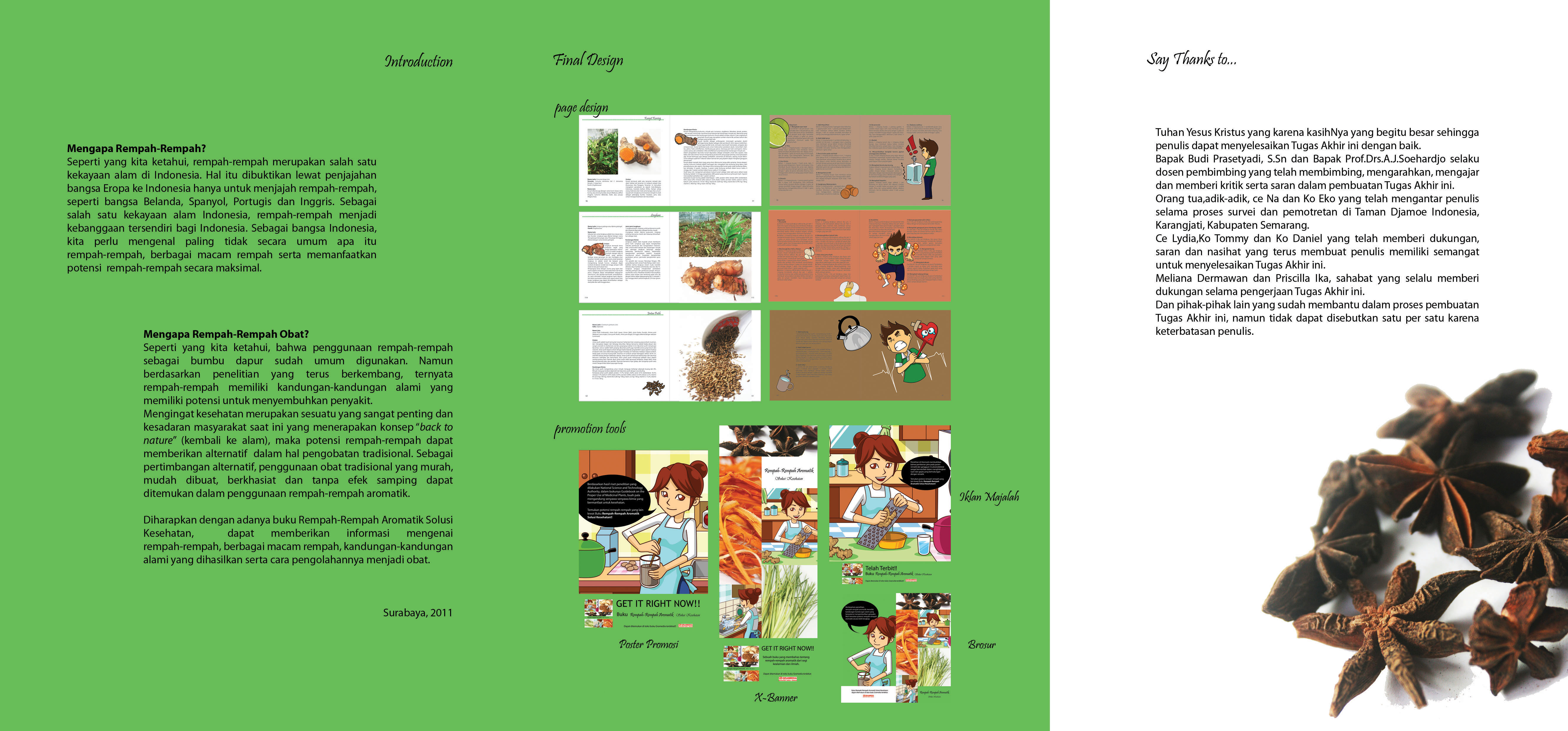 Rempah-rempah adalah bahan aromatik yang digunakan untuk memasak berasal dari tumbuhan dan pada umunya bersifat kering. Saat ini penggunaan rempah-rempah selain untuk keperluan rumah tangga (sebagai bumbu dapur), juga digunakan dalam hal pengobatan. Sifat alami dan tanpa efek samping menjadikan suatu kelebihan tersendiri bagi rempah-rempah. Saat ini dalam hal pengobatan, banyak orang sudah sadar dan mulai kembali ke alam yaitu menggunakan pengobatan tradisional.Perancangan buku ini merupakan media untuk menawarkan sebuah solusi kesehatan lewat penggunaan rempah-rempah aromatik yang alami dan tanpa efek samping. Selain itu, juga memperkenalkan secara lebih mendetail mengenai berbagai macam rempah beserta kandungan-kandungan kimia berpotensi untuk mengobati.