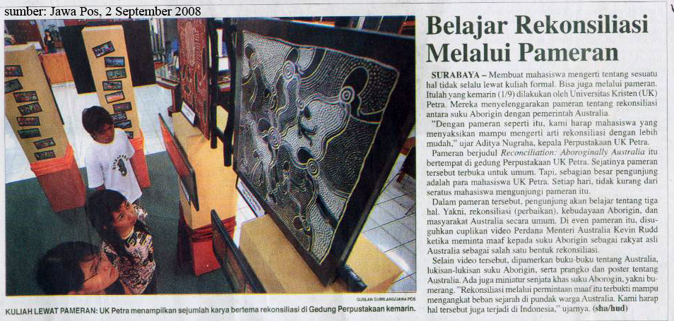 Universitas Kristen Petra (bertempat di Perpustakaan UK Petra) menyelenggarakan pameran tentang rekonsiliasi antara suku Aborigin dengan pemerintah Australia. Dengan adanya pameran tersebut, mahasiswa diharapkan mampu memahami arti rekonsiliasi dengan lebih mudah. Pameran berjudul "Reconciliation:Aboroginally Australia" terbuka untuk umum. Dalam pameran tersebut, pengunjung akan belajar tentang tiga hal. Yakni rekonsiliasi (perbaikan), kebudayaan Aborigin, dan masyarakat Australia secara umum. Dalam pameran itu juga disuguhkan cuplikan video Perdana Menteri Australia Kevin Rudd saat meminta maaf kepada suku Aborigin sebagai rakyat asli Australia sebagai salah satu bentuk rekonsiliasi.