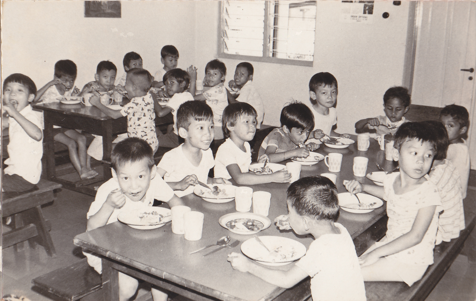 Anak-anak dari Kelompok Asuh bagian anak TK dan SD kelas 1-2 pada waktu makan siang bersama di ruang makan panti pada tahun 1980.