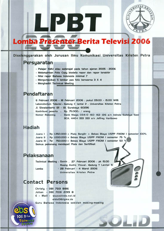 Lomba presenter berita televisi 2006 ini diselenggarakan oleh Jurusan Ilmu Komunikasi Universitas Kristen Petra pada tanggal 28 Februari-4 Maret 2006. Event ini merupakan yang ke 5 sejak pertama kali diadakan tahun 2001. Untuk event tahun lalu dan tahun ini berskala nasional. Tujuan diadakan lomba ini adalah mencari bibit-bibit unggul di bidang penyiaran dan untuk mencetak presenter yang mampu bersaing di dunia broadcasting. Tema lomba tahun ini adalah Solid. Maksud tema ini adalah untuk menyemangati panitia sehingga benar-benar solid. Warna abu-abu yang dipilih untuk poster ini melambangkan solid.