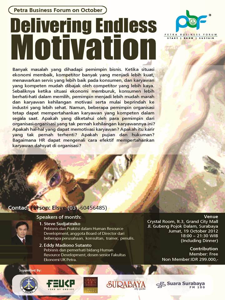 Petra Business Forum pada bulan Oktober 2012 ini digelar dengan tema "Delivering Endless Motivation". Pembicara yang dihadirkan dalam Petra Business Forum kali ini yaitu Steve Sudjatmiko dan Eddy Madiono Sutanto. Acara ini digelar pada tanggal 19 Oktober 2012 bertempat di Crystal Room lt.3, Grand City Mall.