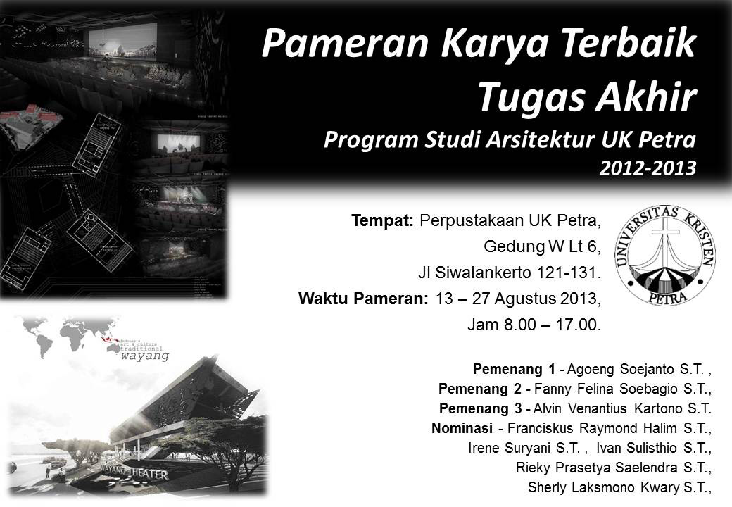 Pameran Karya Terbaik Tugas Akhir Program Studi Arsitektur UK Petra 2012-2013 bertempatkan di Perpustakaan UK Petra, Gedung W Lt 6 pada tanggal 13-27 Agustus 2013 pukul 08.00-17.00.