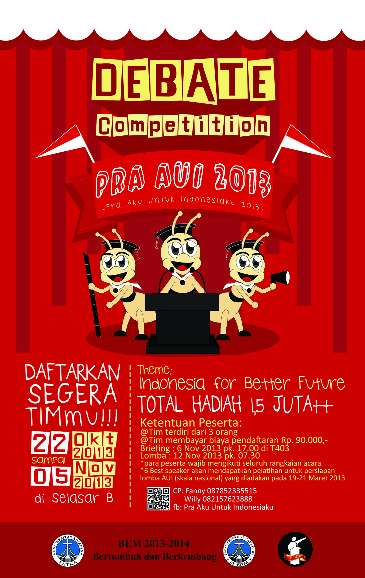 Badan Eksekutif Mahasiswa UK. Petra melalui UKM Debat mengadakan lomba debat dengan tema Pra AUI (Aku untuk Indonesia) 2013. Lomba ini diadakan pada tanggal 12 Nopember 2013 pada pukul 07.30. Pendaftaran untuk mengikuti lomba ini dapat dilakukan pada tanggal 22 Oktober sampai 5 Nopmeber 2013 di selasar B pada Gedung W UK. Petra. Peserta yang ingin mengikuti lomba ini harus membentuk tim yang beranggotakan sebanyak 3 orang dengan biaya pendaftaran sebesar Rp 90.000,00 untuk masing-masing tim.