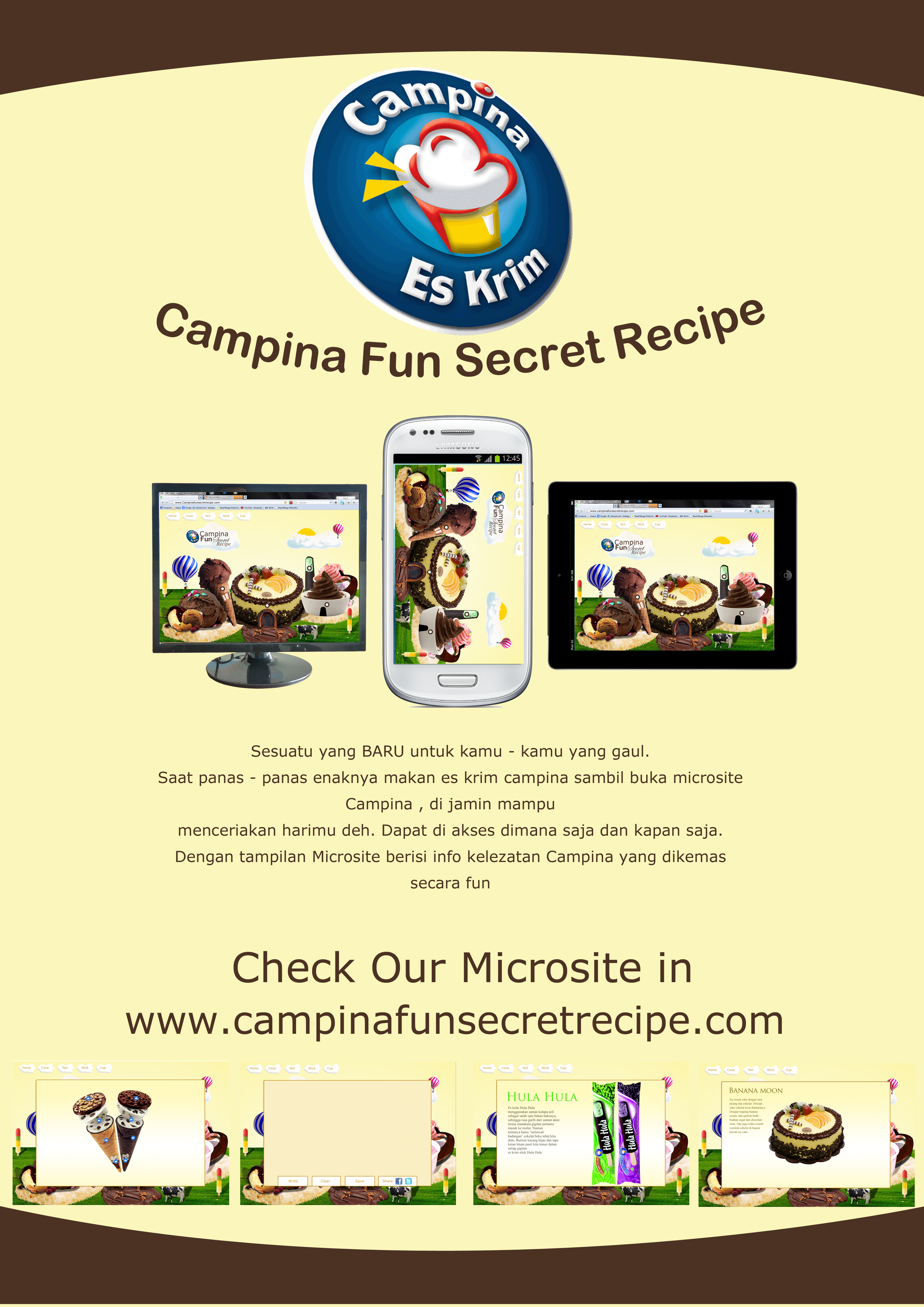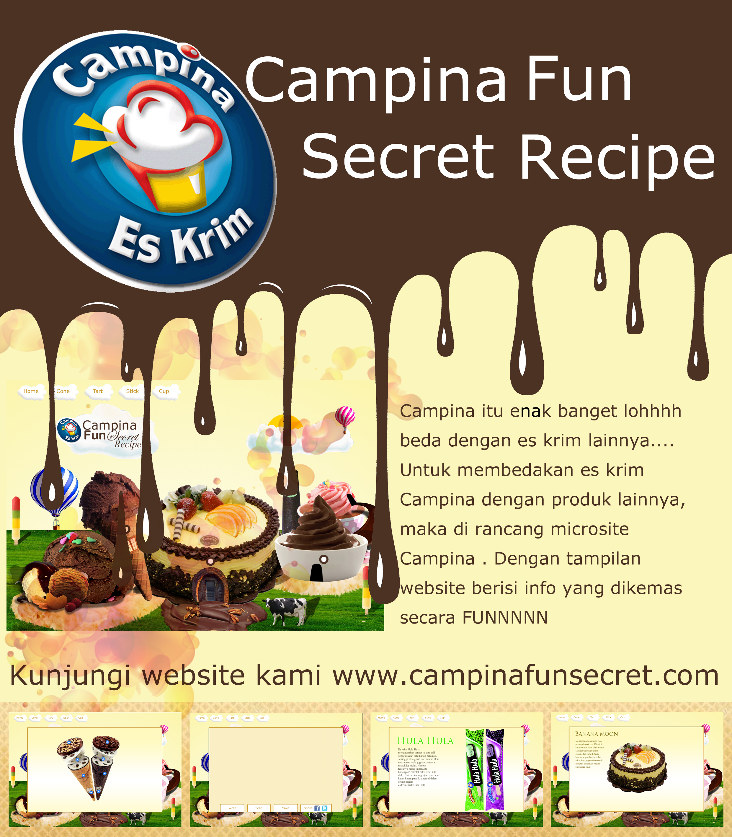 Perancangan ini dilakukan untuk mempromosikan PT Campina Ice Cream Industry beserta produknya. PT Campina Ice Cream Industry diangkat sebagai topic perancangan karena banyak competitor-kompetitor yang bermunculan. Dengan melihat berbagai kelebihan dan kekurangan PT Campina Ice Cream Industry, promosi dirancang agar dapat menggambarkan kelebihan PT Campina Ice Cream Industry. Sehingga diharapkan dapat mengingatkan kembali ice cream Campina dalam benak konsumen. Untuk media promosi digital yang dibuat adalah microsite, ads banner dan facebook, diikuti oleh media penunjang berupa poster, brosur, x-banner, pin dan stiker.