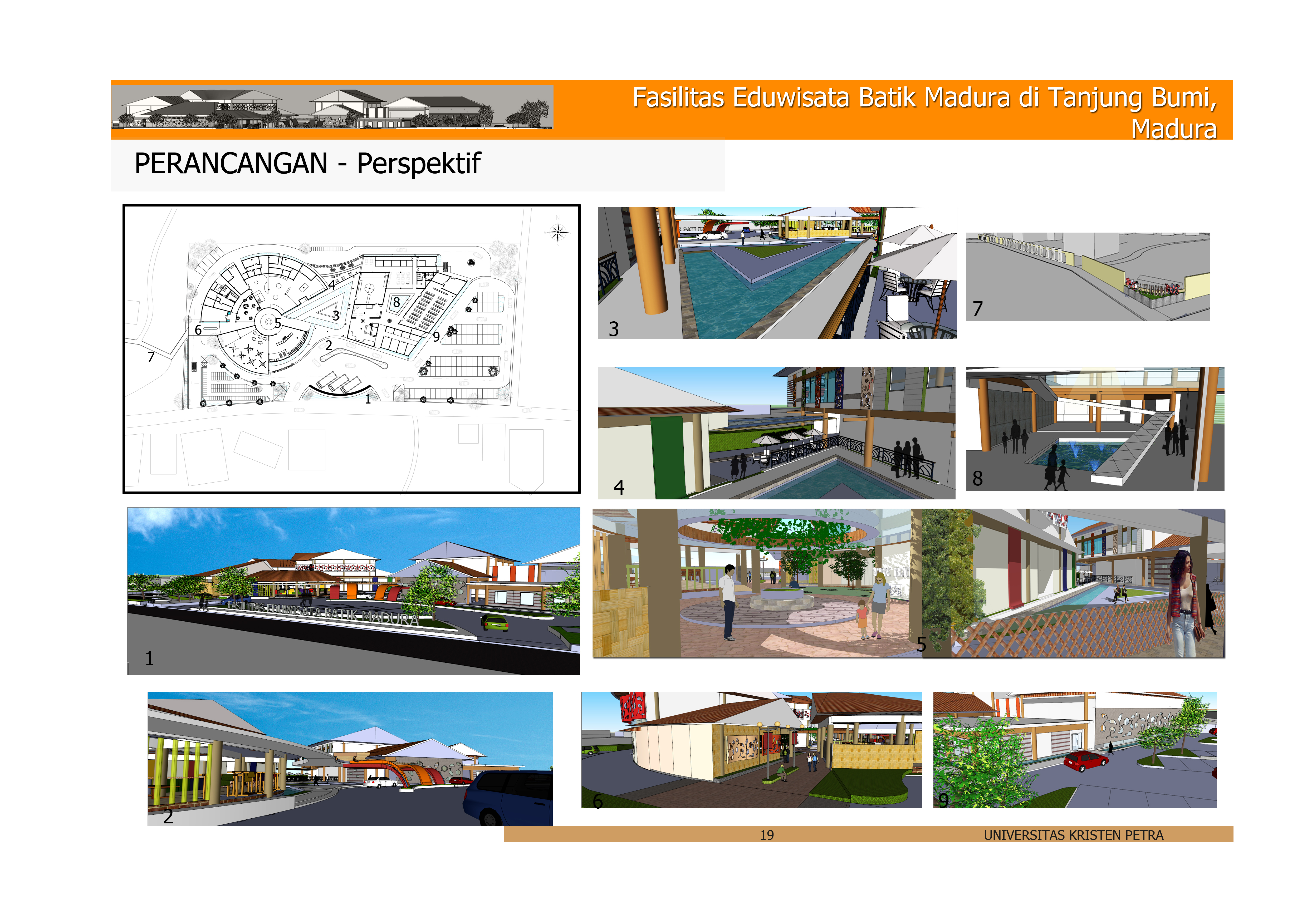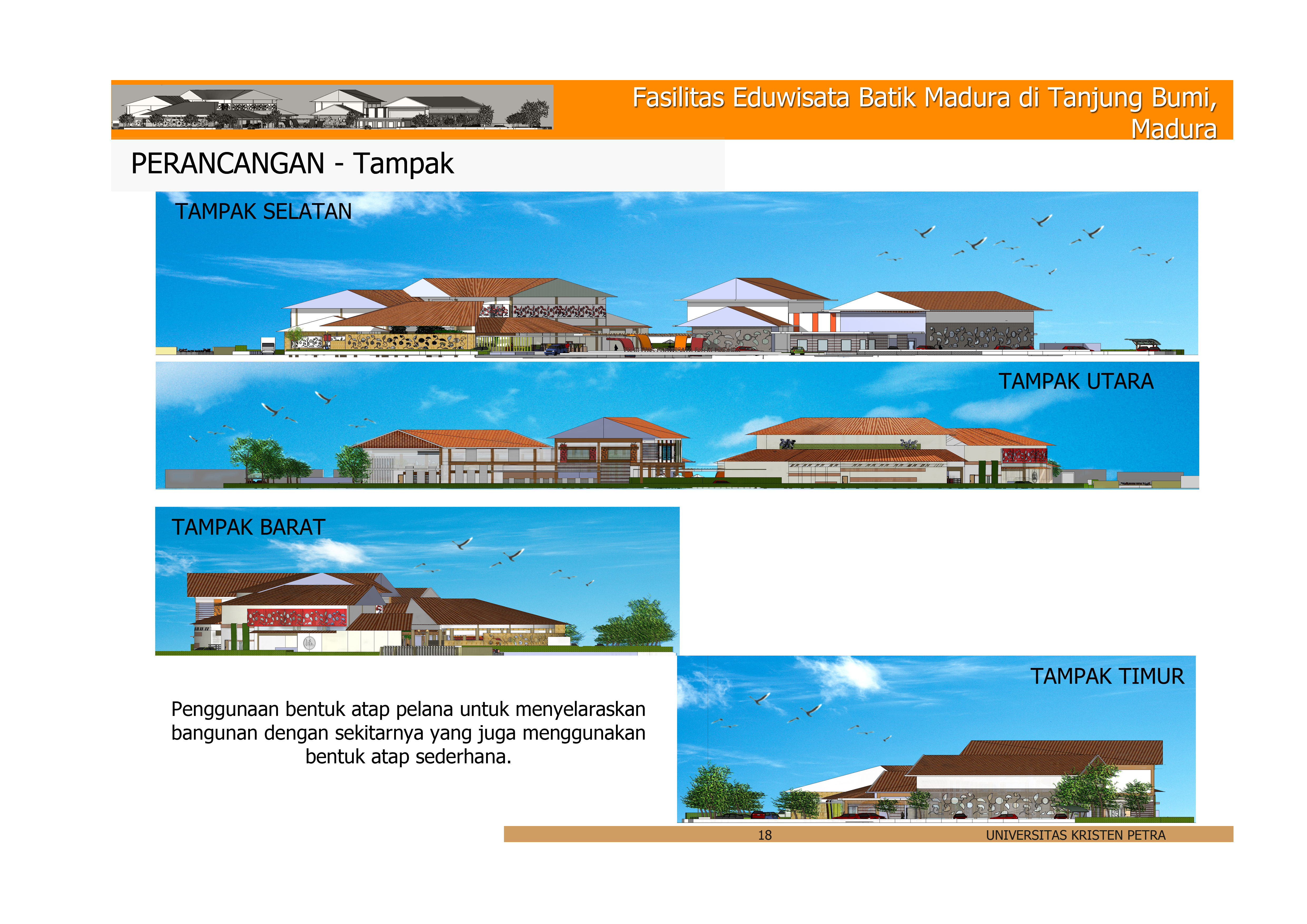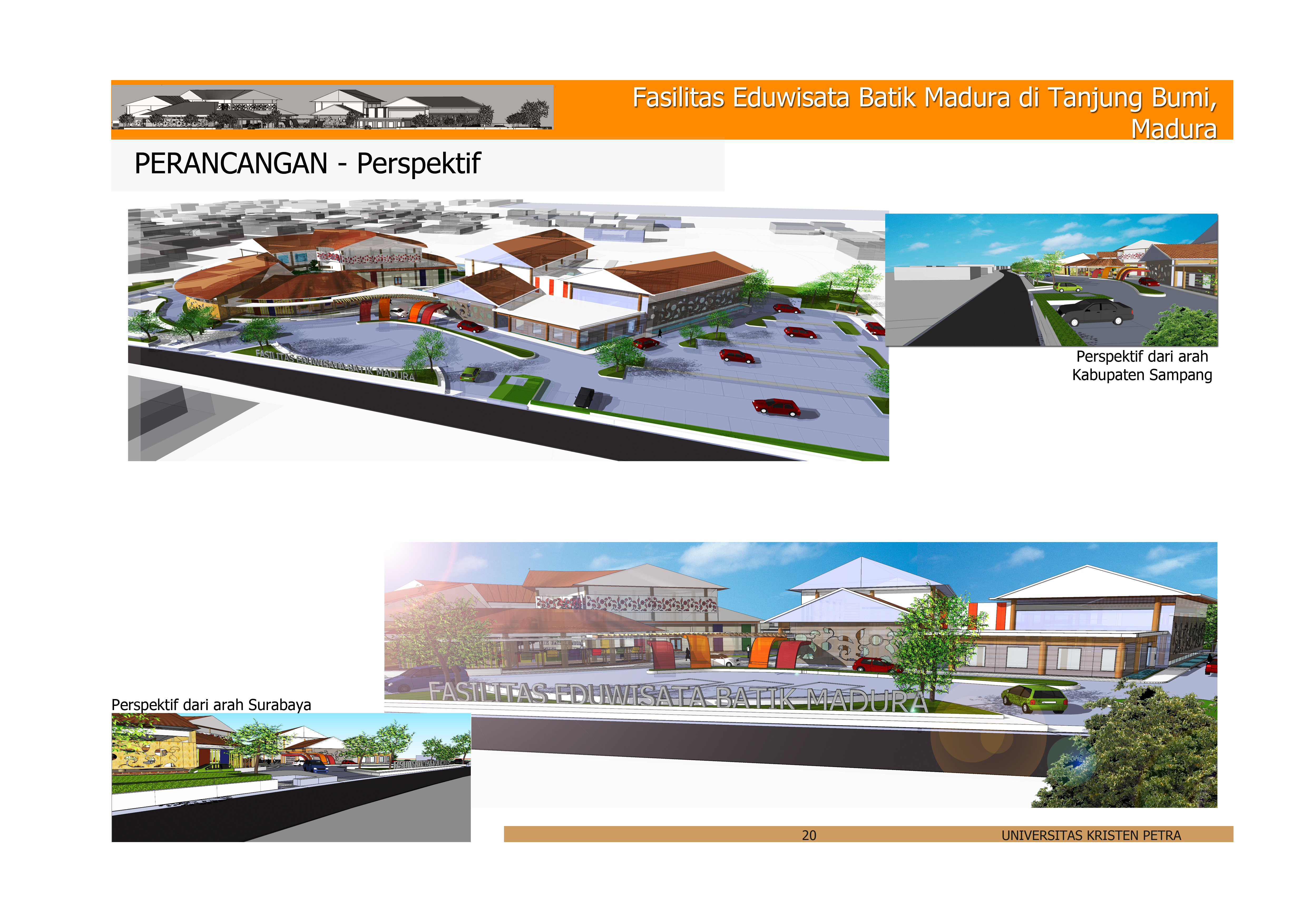 “Fasilitas Eduwisata Batik Madura di Tanjung Bumi, Madura” ini merupakan sarana edukasi wisata yang bertujuan untuk melestarikan dan mengembangkan batik Madura yang sudah mengalami banyak pergeseran budaya akibat modernisasi. Lokasi fasilitas ini berada di Tanjung Bumi, Madura yang merupakan salah satu daerah kampung pengerajin batik terbesar di Madura, sehingga keberadaan fasilitas ini dapat mengikut sertakan pengerajin setempat dalam mengembangkan batik Madura sekaligus meningkatkan kesejahteraan para pengerajin tersebut. Secara umum fasilitas ini mewadahi berbagai kegiatan dan memberikan informasi yang berhubungan dengan batik Madura. Untuk mengekspresikan karakter batik Madura pada fasilitas eduwisata ini, maka pendekatan perancangan yang digunakan adalah pendekatan simbolik yaitu memberikan makna batik pada bangunan. Perwujudan pendekatan ini ditampilkan melalui makna cerita motif batik Madura sebagai konsep perancangan yang di transformasikan ke bentuk massa bangunan. Adapun aplikasi dari karakter batik tersebut juga digunakan untuk membentuk karakter ruang dari fasilitas tersebut.
