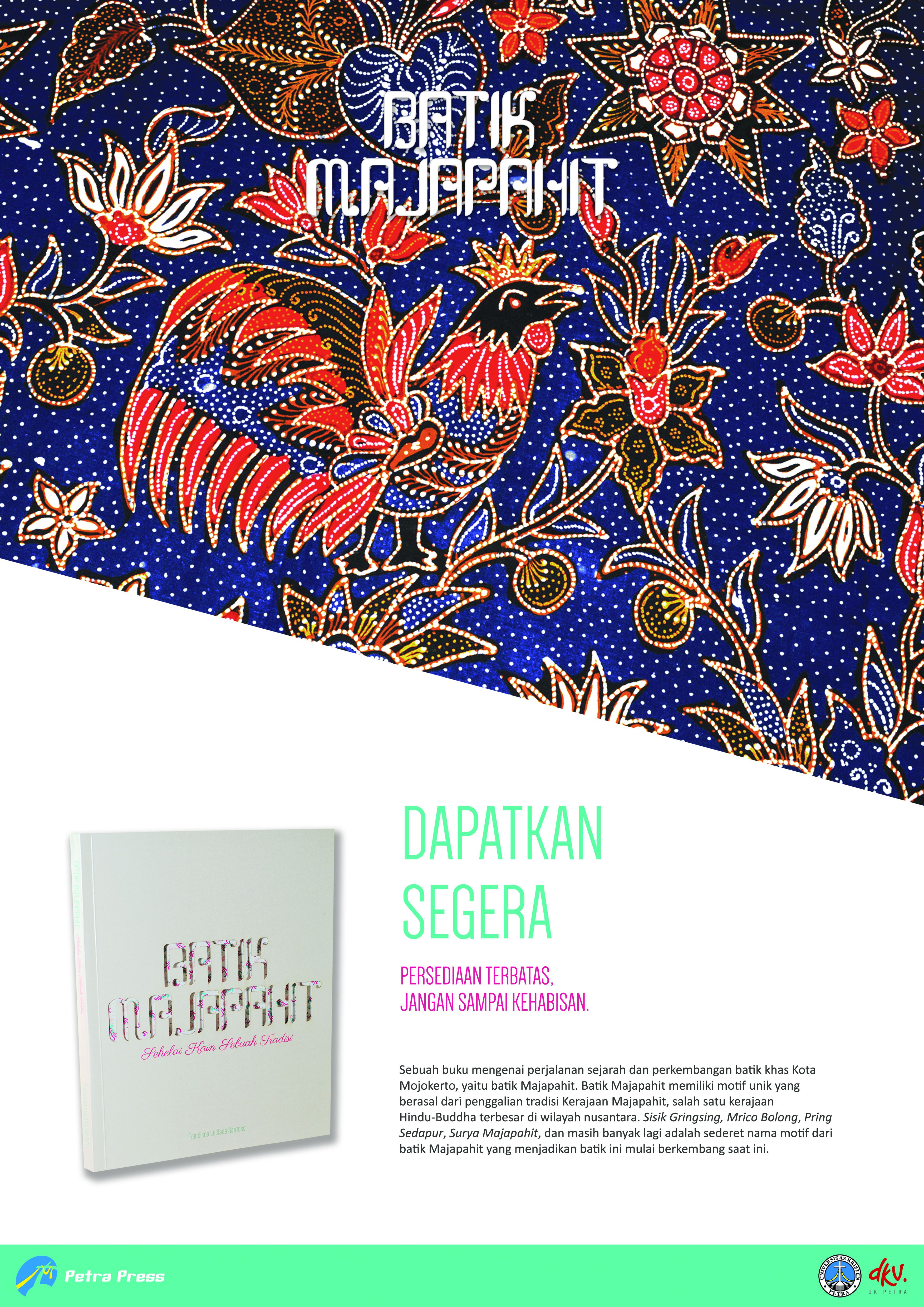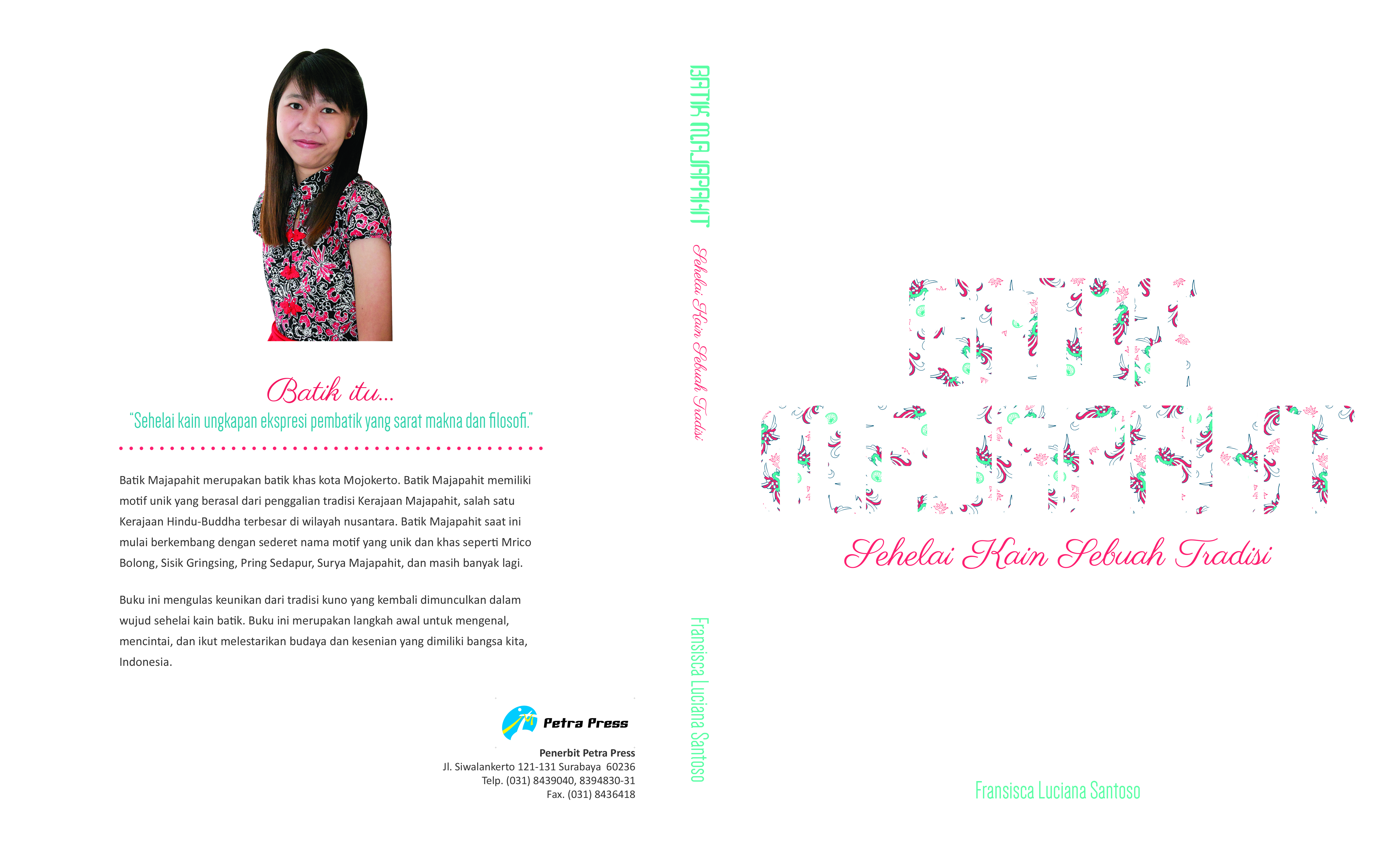 Batik Mojokerto merupakan batik khas kota Mojokerto. Batik Mojokerto ini memiliki motif unik yang berasal dari penggalian tradisi Kerajaan Majapahit, salah satu Kerajaan Hindu-Buddha terbesar di wilayah nusantara. Batik Mojokerto memiliki dua karakteristik warna, yaitu sogan, dominan berwarna cokelat (klasik) dan berwarna-warni (dinamis). Perlu diapresiasi bahwa batik Mojokerto saat ini mulai berkembang dengan sederet nama motif yang unik dan khas mulai berkembang seperti Mrico Bolong, Sisik Gringsing, Pring Sedapur, Surya Majapahit, dan masih banyak lagi. Namun demikian, batik Mojokerto belum begitu dikenal oleh masyarakat. Oleh karena itu, perancangan buku ini dibuat agar batik Mojokerto dapat dikenal oleh masyarakat luas. Dengan demikian diharapkan masyarakat akan mulai mengenal, mencintai, dan ikut melestarikan budaya dan kesenian yang dimiliki bangsa kita, Indonesia.