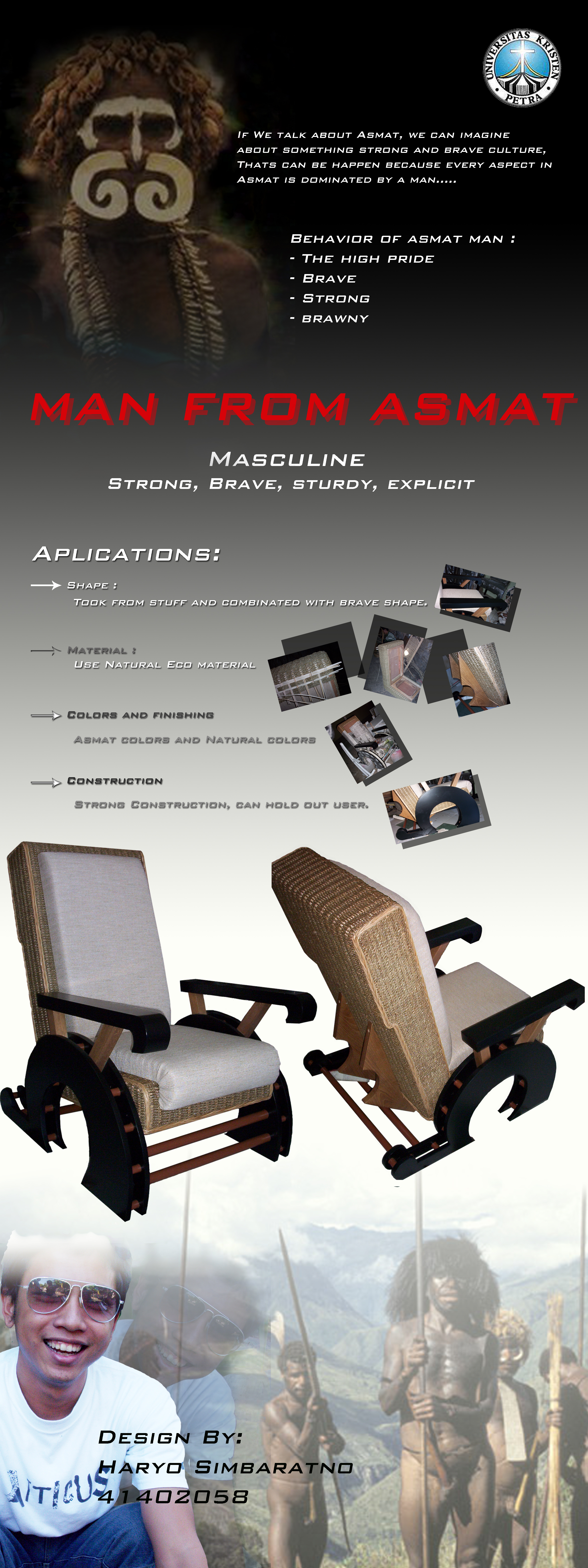 Mendesain kursi santai dengan mengambil budaya Asmat. Konsep yang diambil adalah suku Asmat khususnya Pria Asmat yang memiliki perilaku: harga diri tinggi, berani, status lebih tinggi dari wanita dan kuat. Benda yang lekat dengan pria Asmat: tombak, Perisai, Tifa, Kapak, Simbul-simbul Asmat. Desain yang dibuat memiliki karakter pria yang kuat. Aplikasi desain: Bentuk diambil dari bentuk benda yang ditransformasikan dengan bentuk-bentuk yang berani. Bahan yang digunakan menggunakan bahan yang eco material (ramah lingkungan). Bahan yang digunakan seperti kayu, rotan dan mendong. Warna.