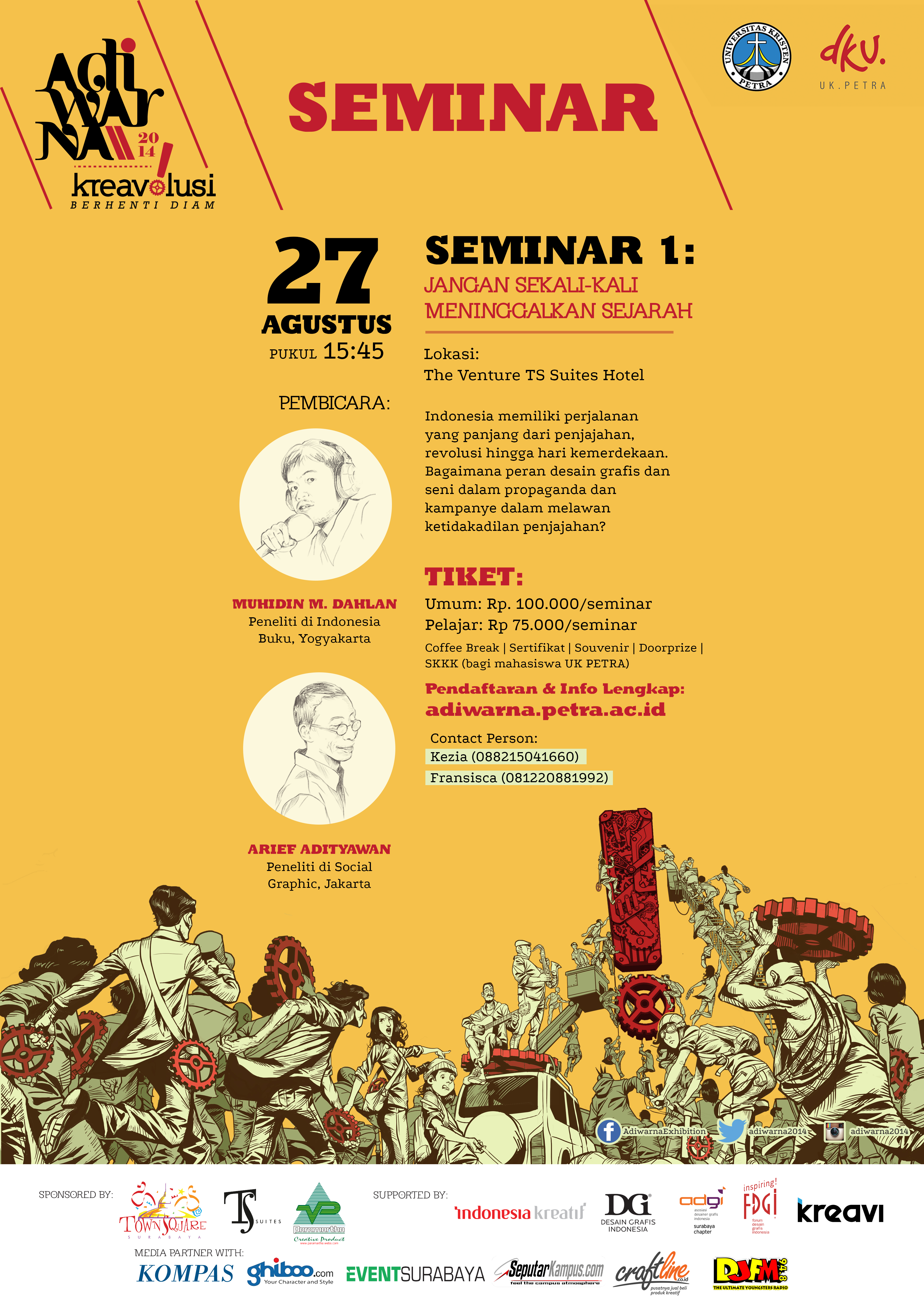 Adiwarna 2014 mengadakan seminar yang dilaksanakan pada 27 Agustus 2014 dengan tema “Jangan Sekali-kali Meninggalkan Sejarah”. Seminar ini menghadirkan Muhidin M. dahlan dan Arief Adityawan sebagai pembicara. Dikenakan biaya tiket sebesar Rp 100.000 untuk umum dan Rp 75.000 untuk pelajar, pendaftaran dan info lengkap dapat diakses melalui adiwarna.petra.ac.id.