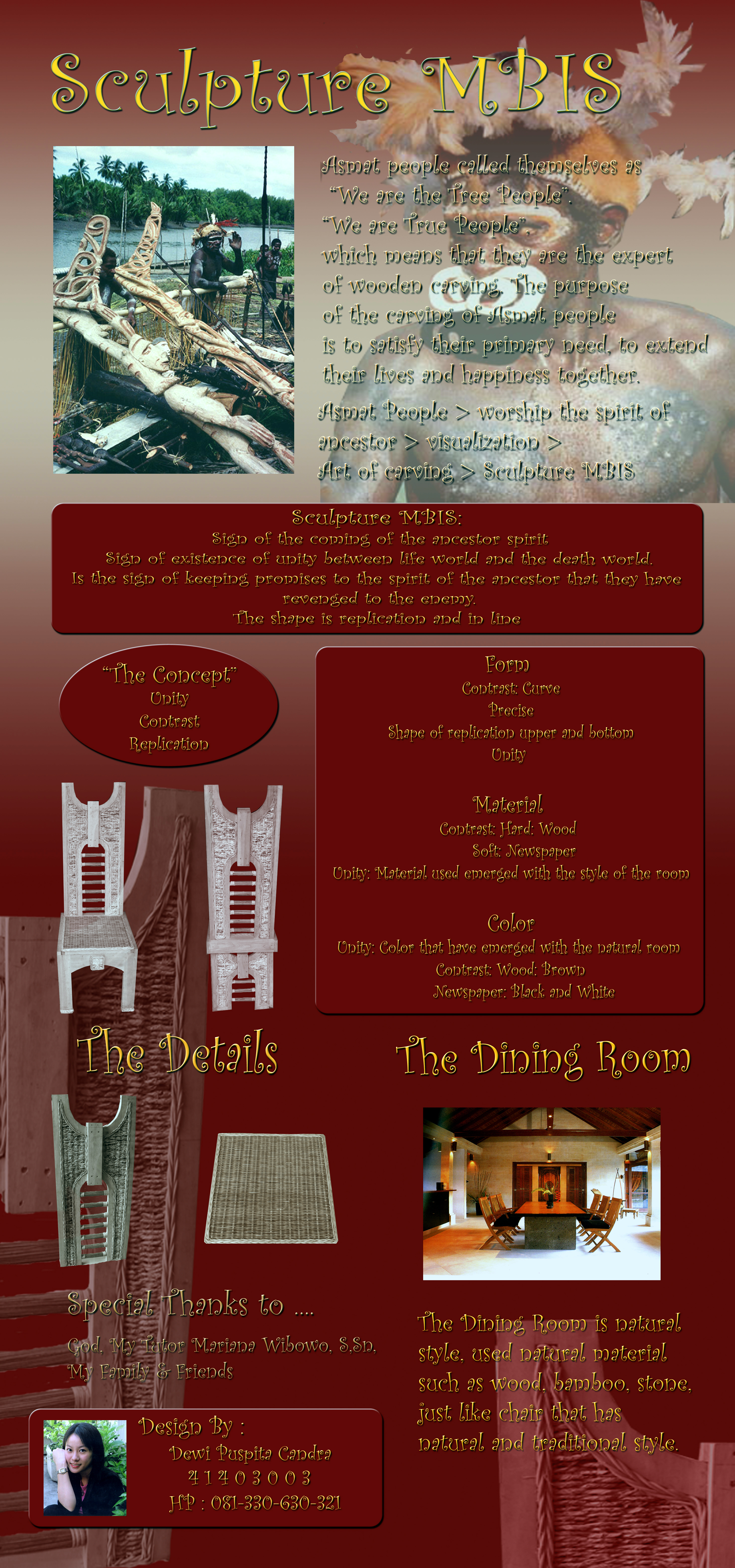 Tujuan dari ukiran orang Asmat adalah untuk memenuhi kebutuhan pokok manusia sehingga kelihatan lebih detail bahwa tujuan akhir mereka ialah kelanjutan dari hidup dan kebahagiaan bersama. Dari kisah inilah saya tertarik untuk memilih budaya suku Asmat untuk perancangan kursi budaya. Dengan menggunakan ruang makan yang bernuansa natural dan tradisional sangat cocok dengan budaya Asmat yang juga masih tradisional, dan dalam keseniannya pula banyak yang menggunakan bahan- bahan alami.