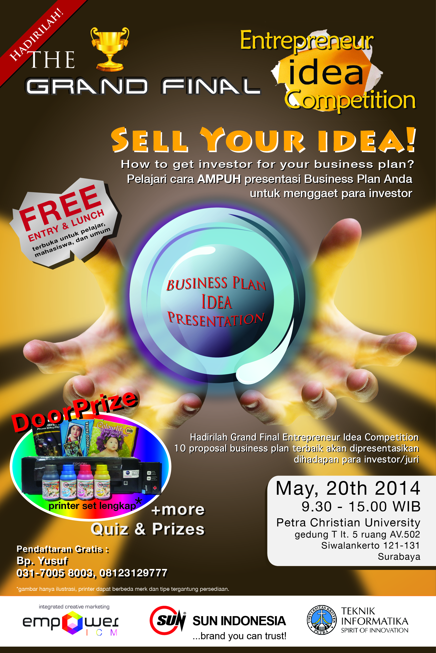Hadirilah The Grand FInal Enterpreneur idea Competition pada tanggal 20 Mei 2014 pukul 09.30 - 15.00 WIB bertempat di gedung T lt.5 ruang AV 502 Universitas Kristen Petra dan menangkan doorprize.