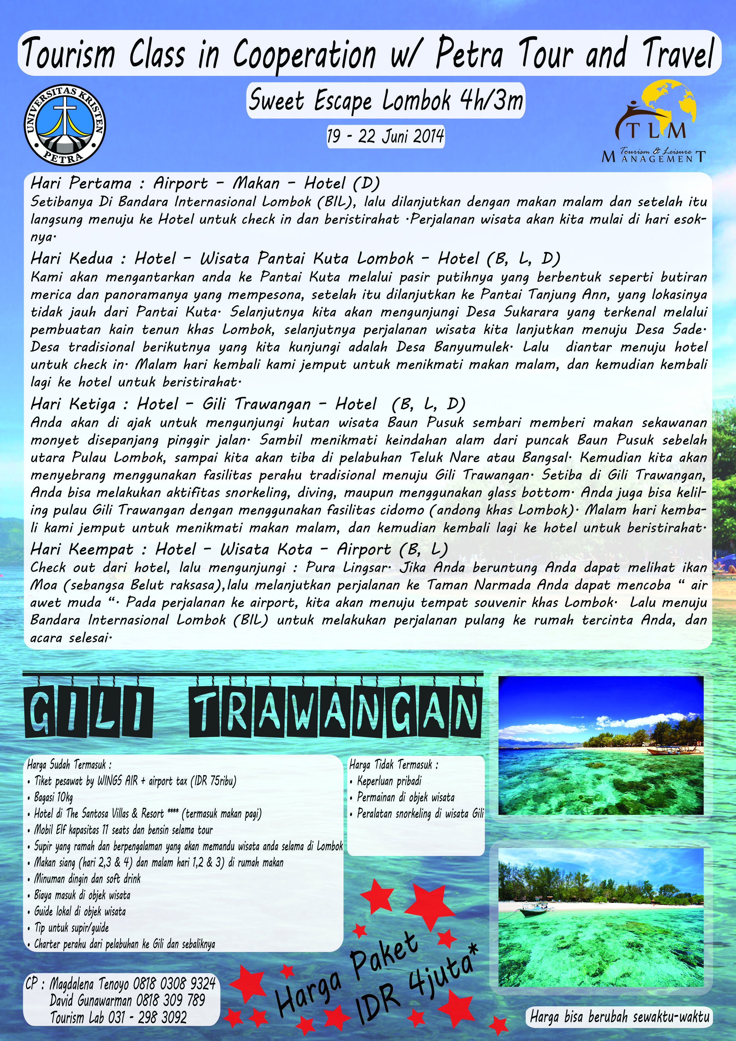 Kegiatan yang diadakan oleh Manajemen Pariwisata UK Petra kali ini adalah “Sweet Escape Lombok”, kegiatan yang mengunjungi Pulau Gili Trawangan, Lombok. Dengan membayar biaya kegiatan sebesar Rp 4.000.000 tersebut juga di meriahkan oleh serangkaian kegiatan seperti mengunjungi Pantai Tanjung Ann, Gili Trawangan, dan melihat ikan Moa (sebangsa Belut Raksasa).Untuk informasi lebih lanjut dapat menghubungi Magdalena Tenoyo (081803089324) atau David Gunawarman (0818309789) dan Tourism Lab (031-2983092).