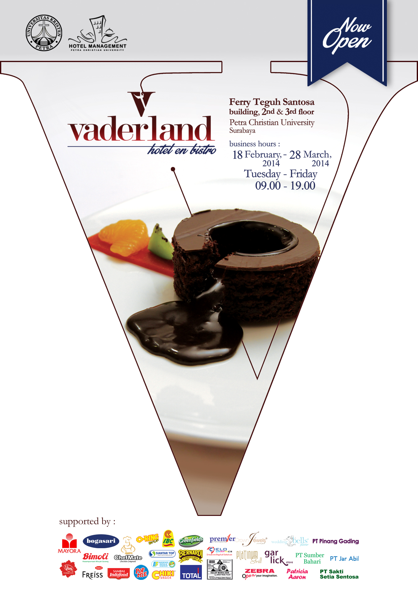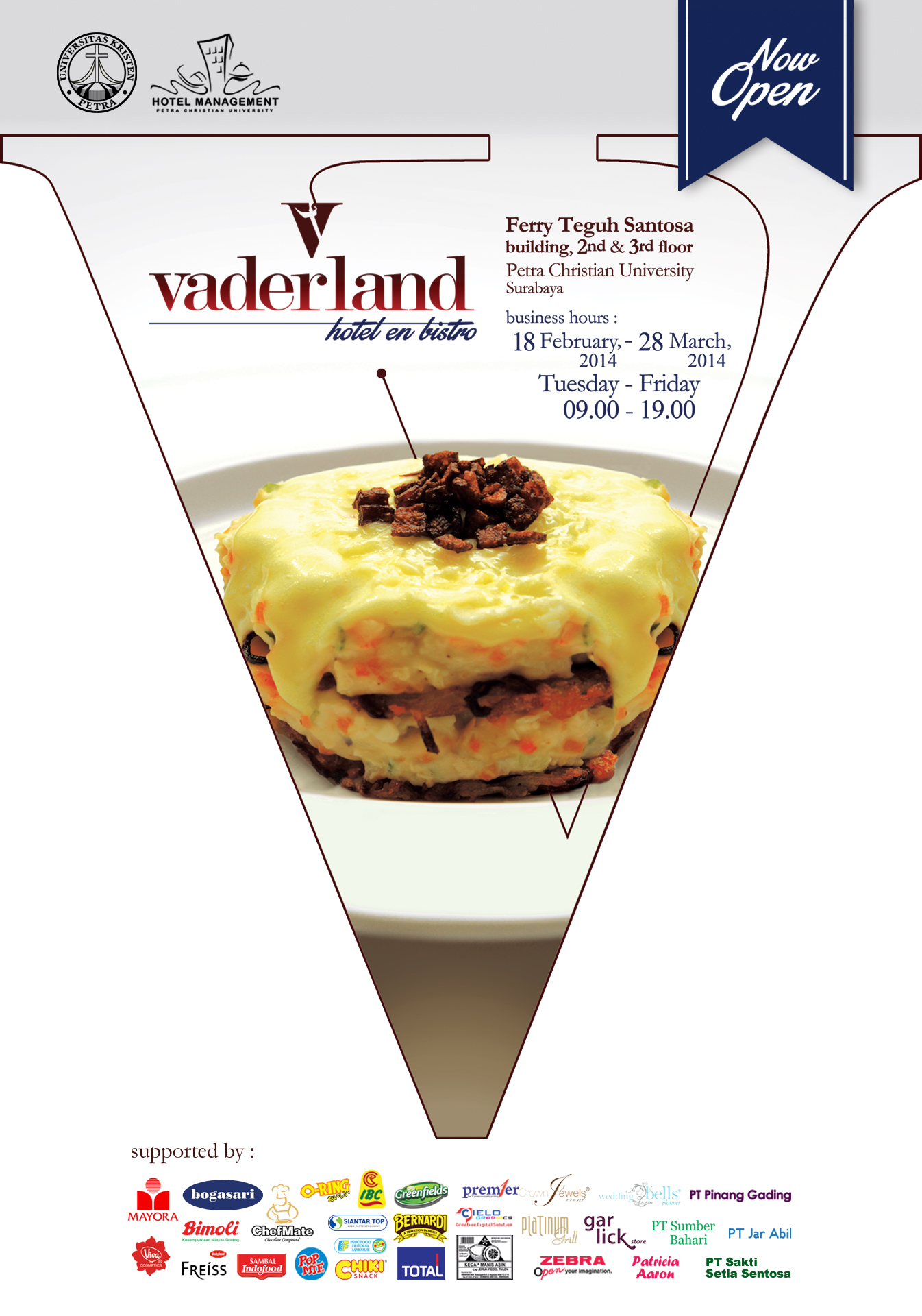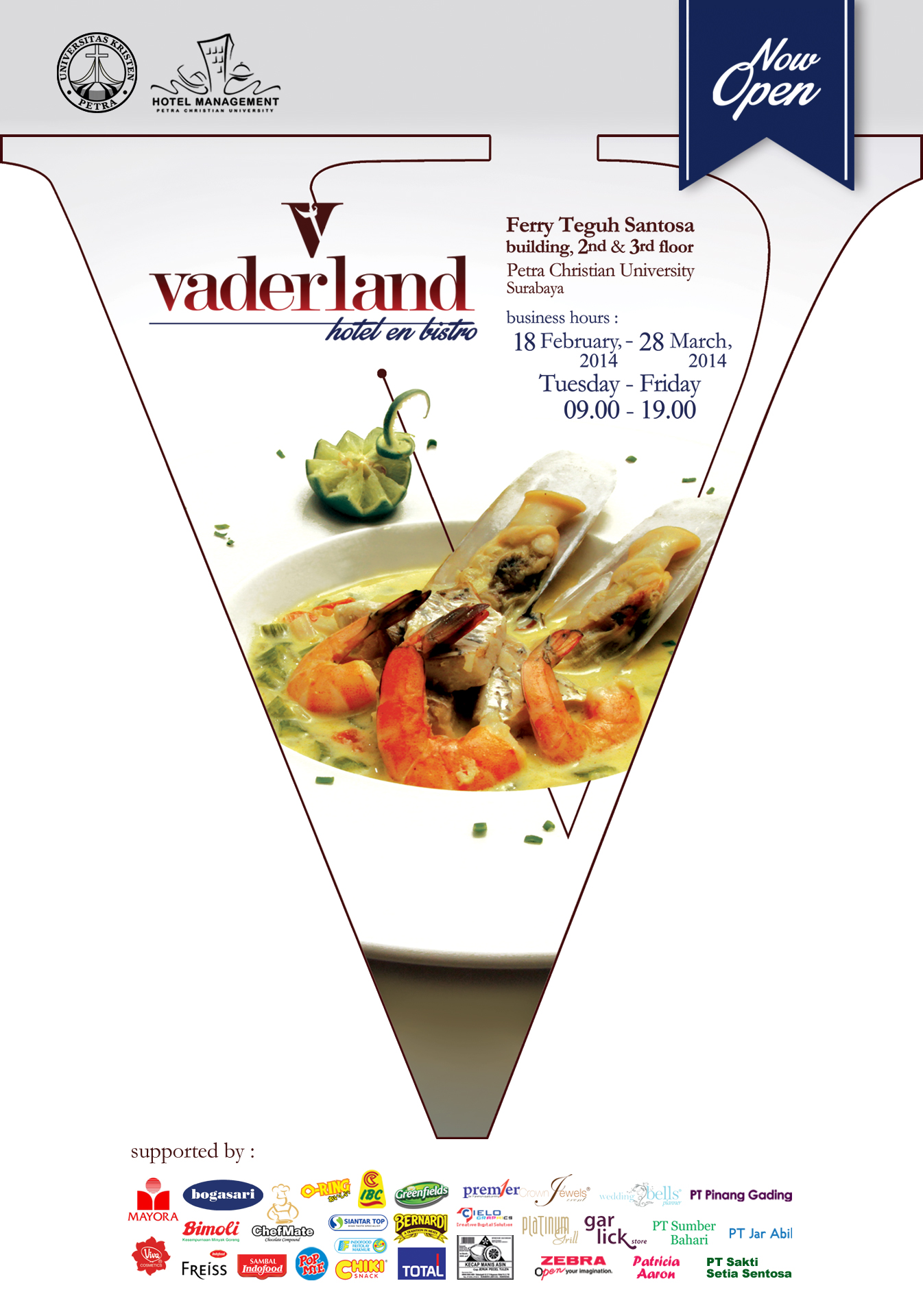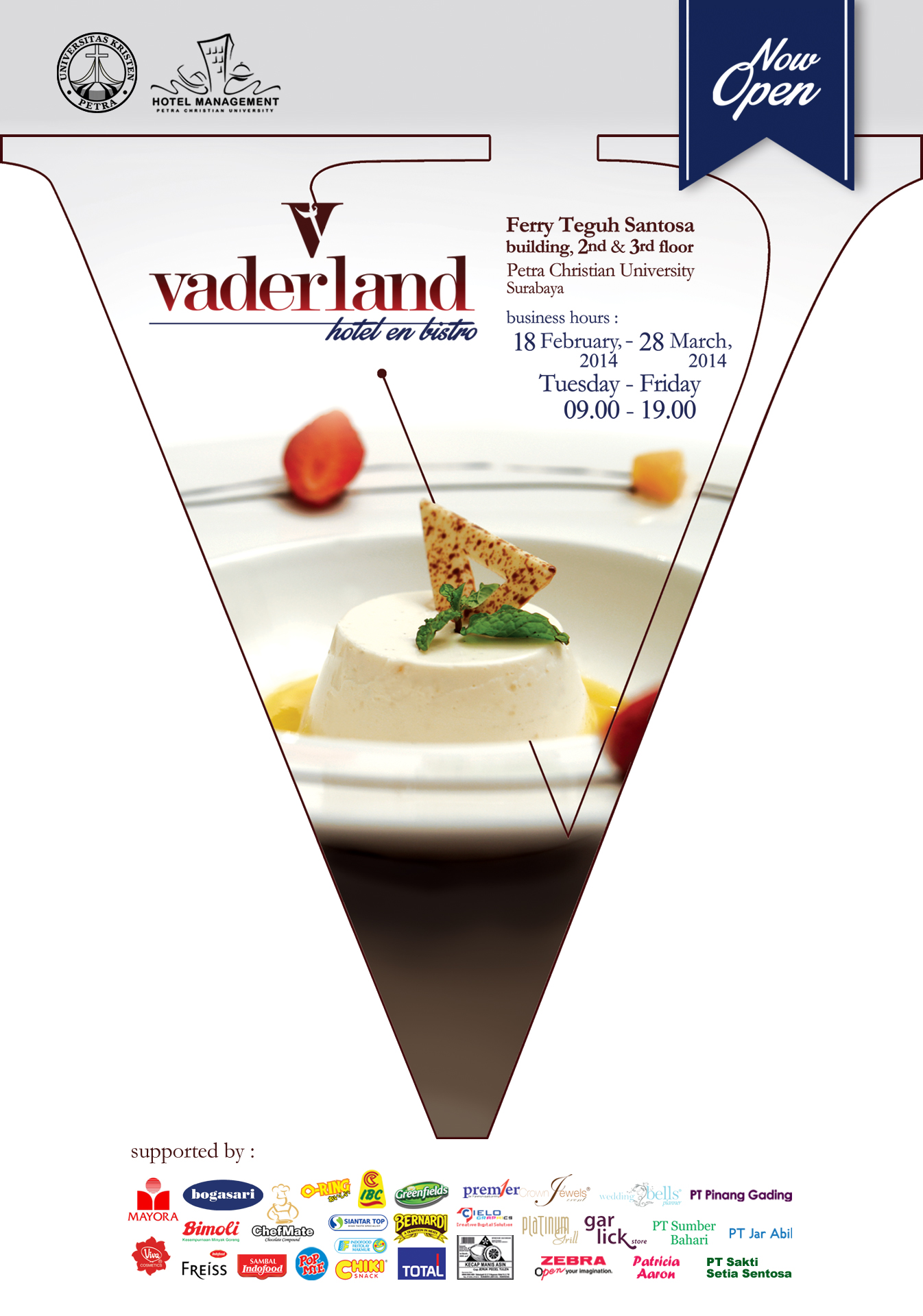 Telah dibuka Vaderland Hotel en Bistro yang bertempat di Ferry Teguh Santosa lantai 2 dan 3 Universitas Kristen Petra. Vaderland Hotel en Bistro akan dibuka mulai tanggal 18 Februari - 28 Maret 2014 pada pukul 09.00-19.00 WIB.