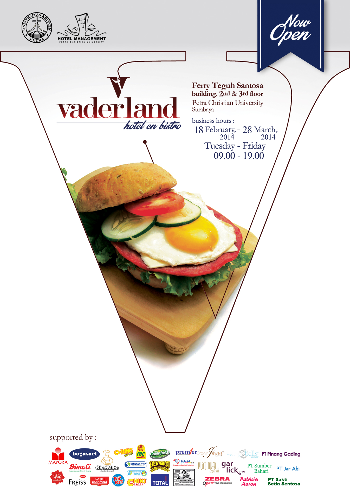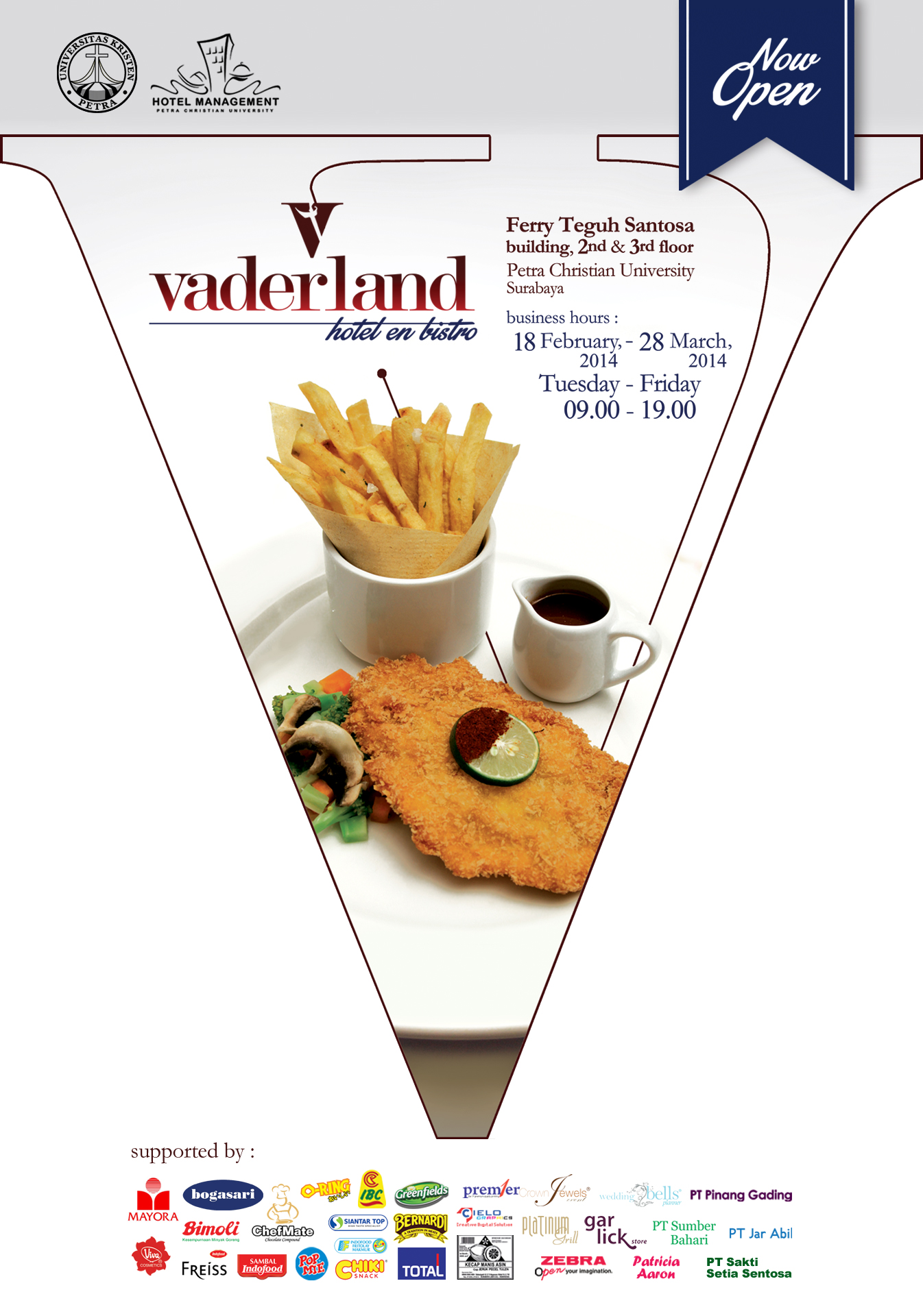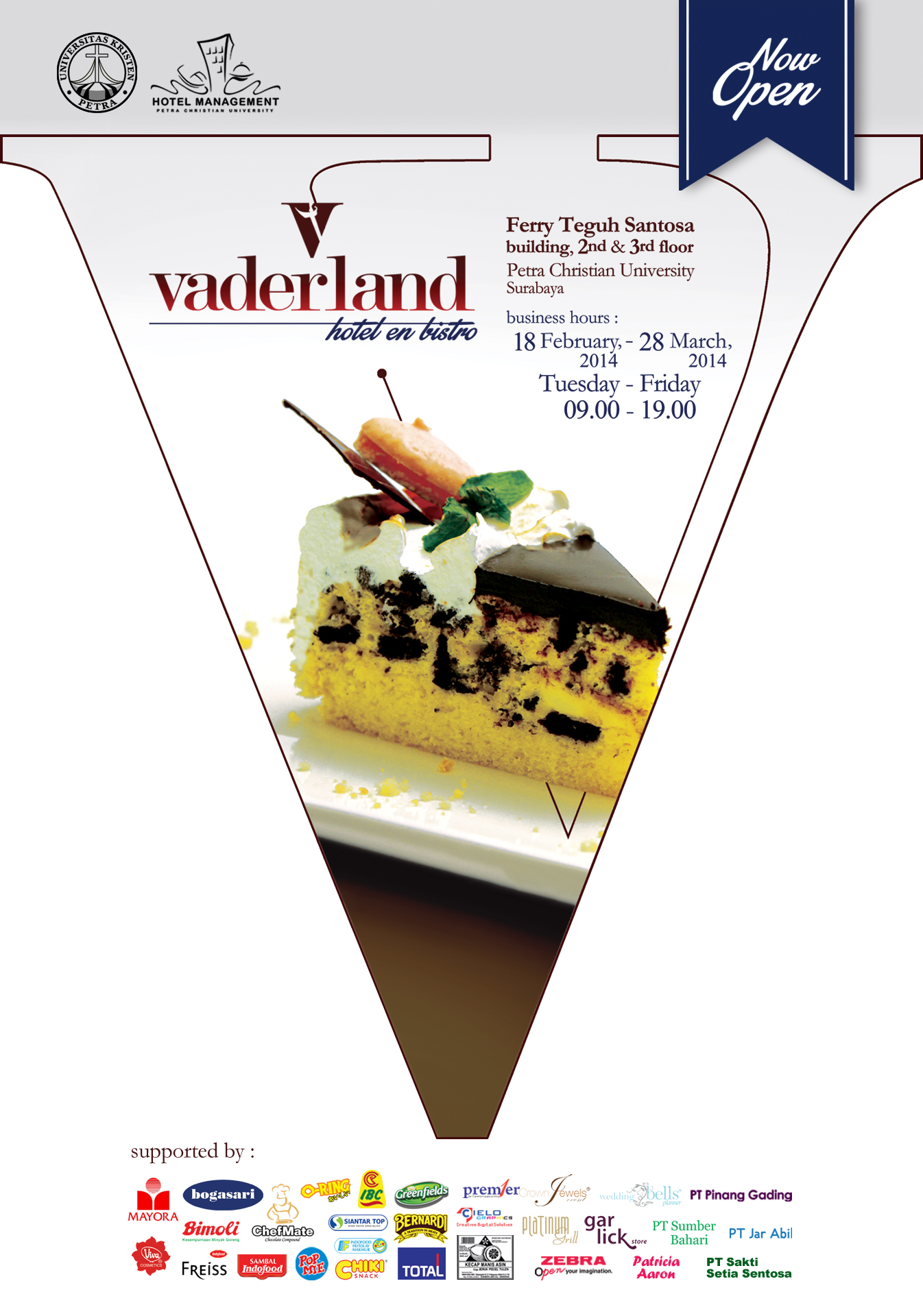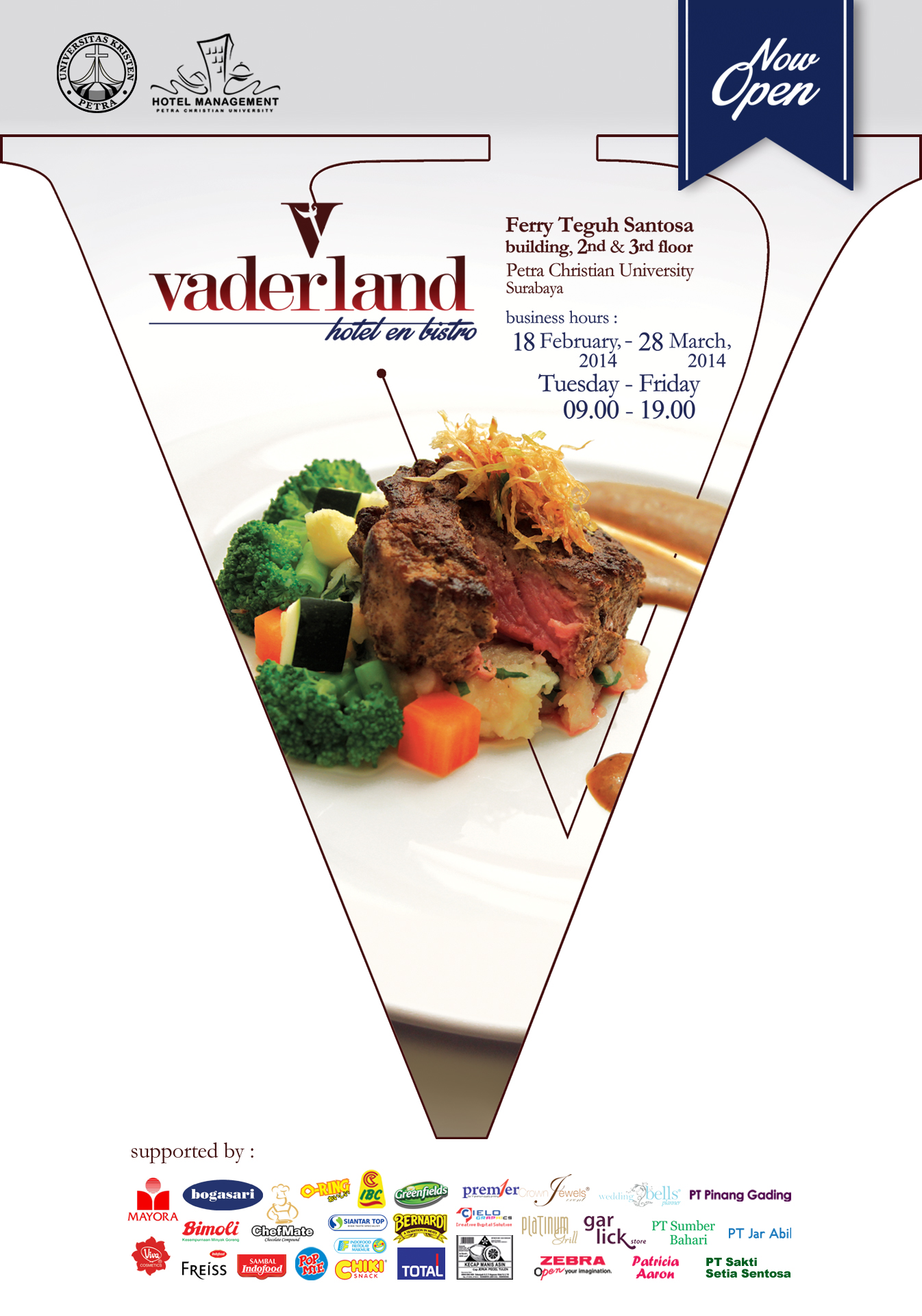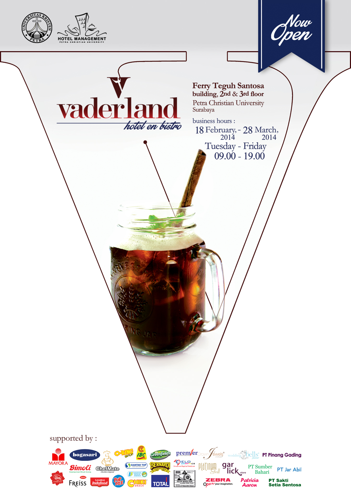 Telah dibuka Vaderland Hotel en Bistro yang bertempat di Ferry Teguh Santosa lantai 2 dan 3 Universitas Kristen Petra. Vaderland Hotel en Bistro akan dibuka mulai tanggal 18 Februari - 28 Maret 2014 pada pukul 09.00-19.00 WIB.