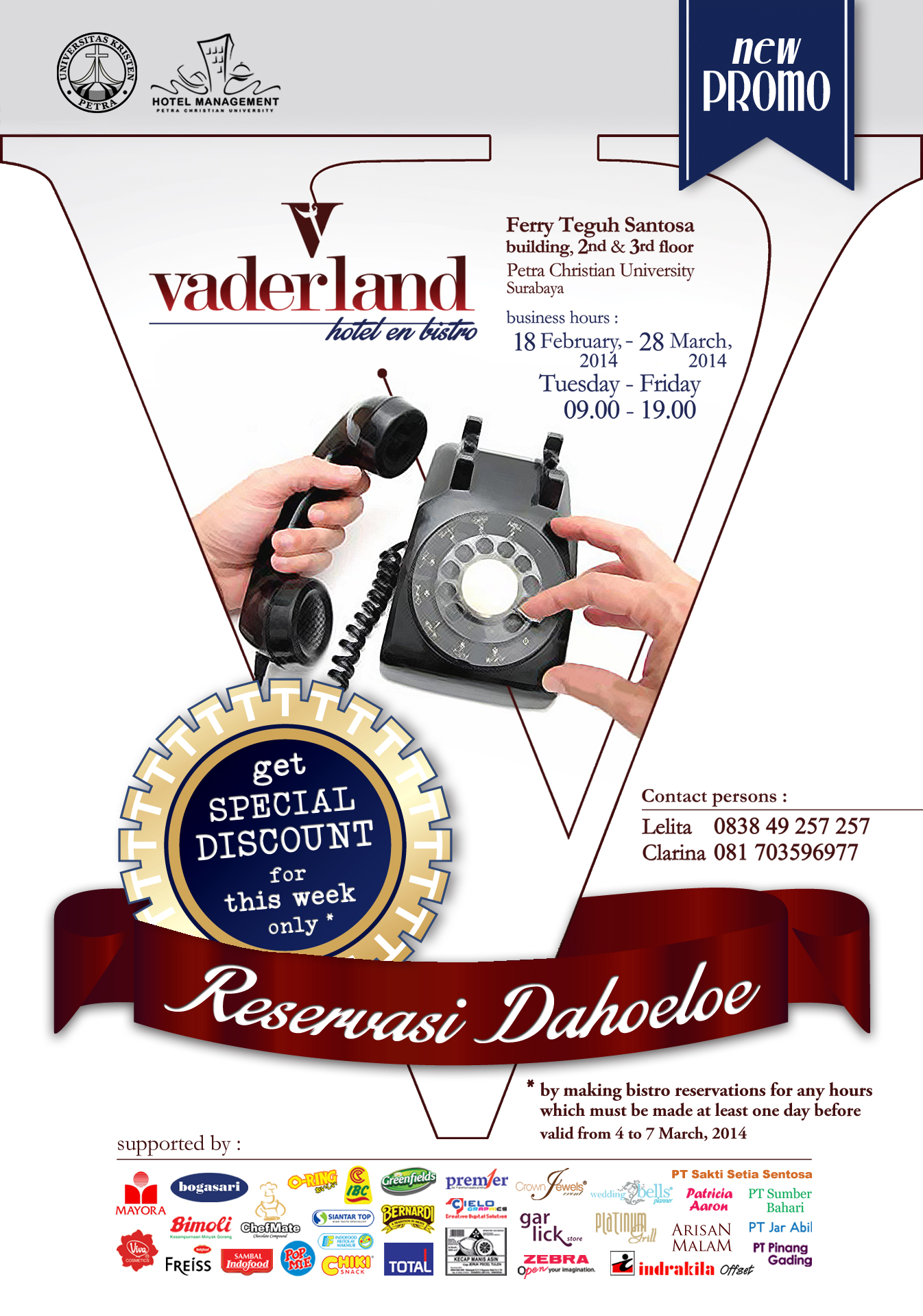 Vaderland Hotel en Bistro mengadakan special diskon untuk minggu ini dengan syarat konsumen harus membuat reservasi terlebih dahulu minimal satu hari sebelumnya berlaku mulai tanggal 4 hingga 7 Maret 2014 saja. Untuk informasi lebih lanjut dapat menghubungi Lelita (083849257257) atau Clarina (081703596977).