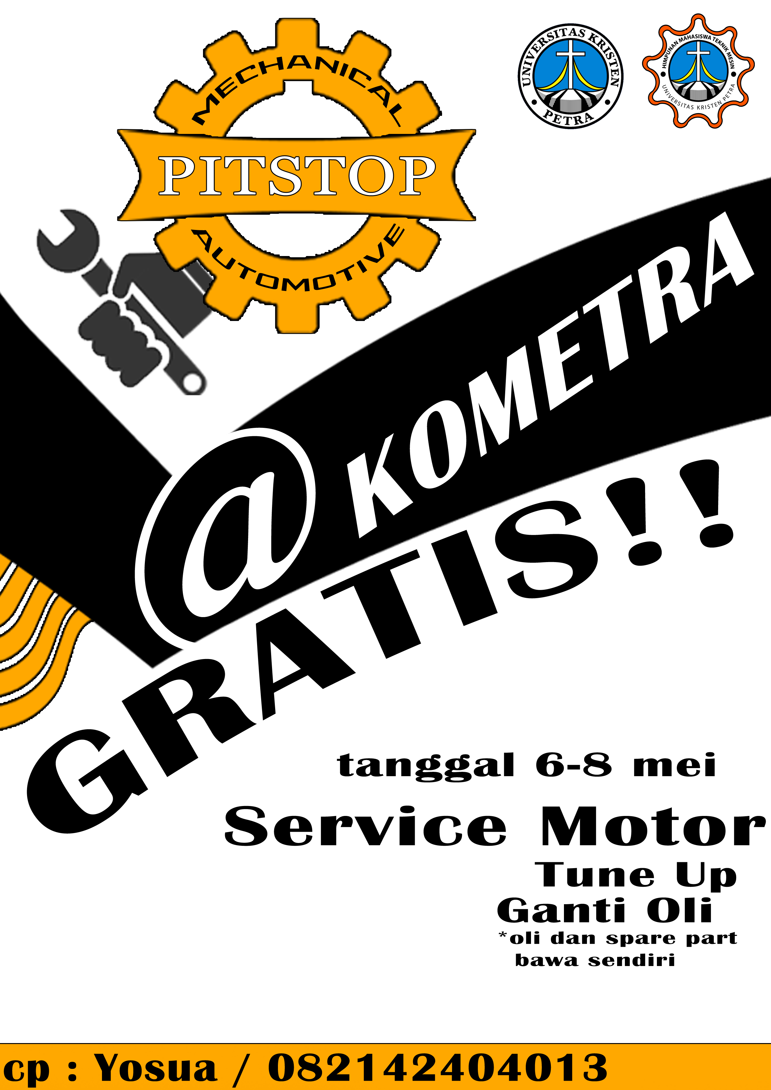 Program Studi Teknik Otomotif UK Petra mengadakan service motor gratis. Service motor yang dimaksud adalah tune up dan ganti oli. Kegiatan dilaksankaan pada tanggal 6 - 8 Mei. Untuk informasi lebih lanjut dapat menghubungi Yosua / 082142404013.
