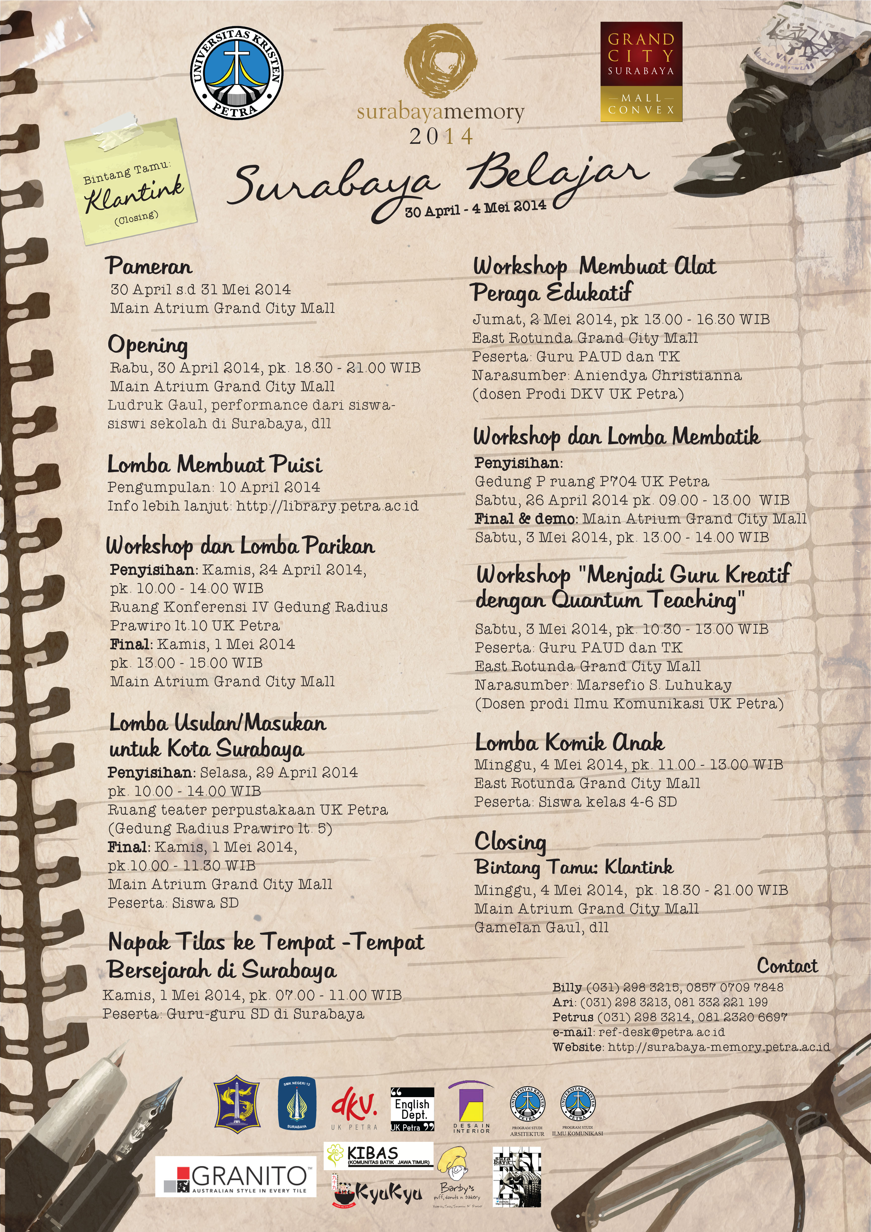 Surabaya Memory 2014 mempersembahkan Surabaya Belajar, yang dilaksanakan pada tanggal 30 April – 4 Mei 2014. Surabaya Memory akan dimeriahkan oleh serangkaian acara seperti pameran, lomba membuat puisi, lomba komik anak, dan lain-lain. Dalam kegiatan ini juga dihadiri Klantink sebagai bintang tamu.