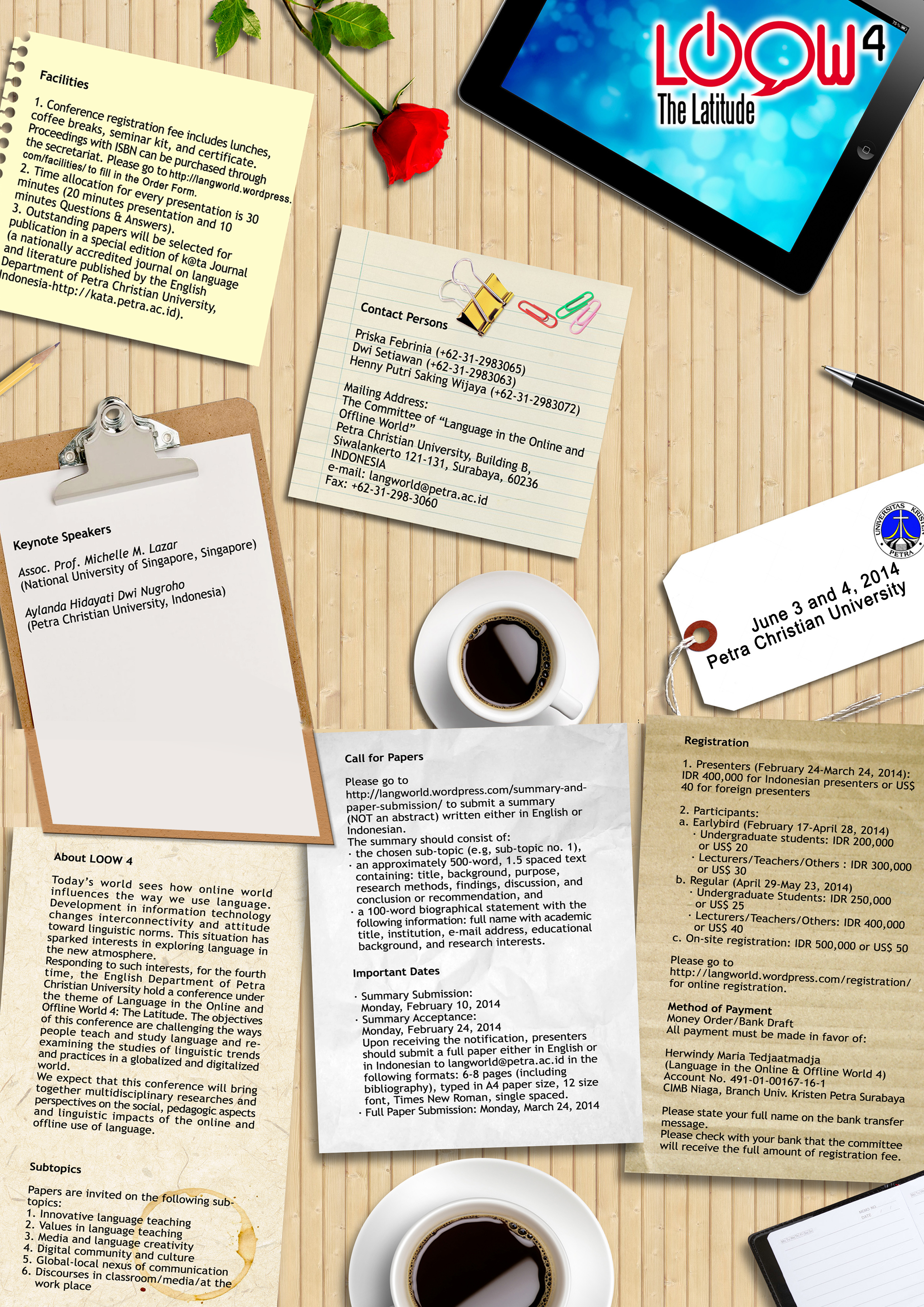 LOOW (Language in the Online and Offline World 4), adalah kegiatan yang diadakan oleh Program Studi Sastra Inggris, untuk ke-4 kalinya kegiatan ini diadakan. Dengan tema The Latitude, kegiatan ini akan diselenggarakan dengan membahas beberapa topic seperti kreativitas dalam media dan bahasa, pengajaran bahasa yang invotif, dan lain-lain. Kegiatan LOOW dilaksanakan pada tanggal 3-4 Juni 2014 bertempat di Universitas Kristen Petra dengan pembicara Assoc. Prof. Michelle M. Lazar dan Aylanda Hidayati Dwi Nugroho. Untuk informasi lebih lanjut dapat menghubungi Priska Febrian (+62-31-2983065), Dwi Setiawan (+62-31-2983063) atau Henny Putri Saking WIjaya (+62-31-2983072) atau dapat menghubungi lewat email di langworld@petra.ac.id.