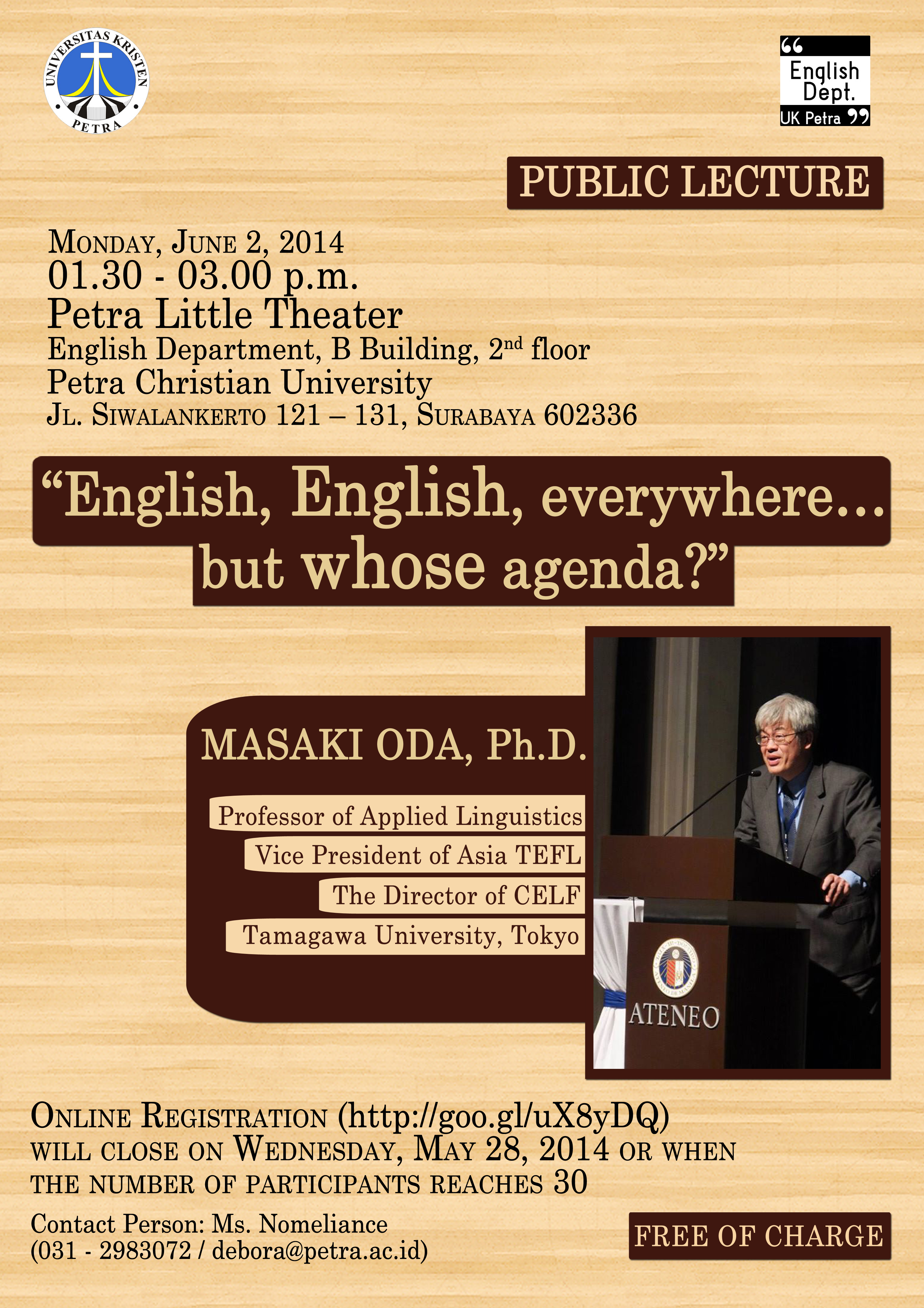 Program Studi Sastra Inggris UK Petra, mengadakan kuliah umum yang dilaksanakan pada hari Senin, 2 Juni 2014 pada pukul 13.30-15.00 dengan tema “English, English, everywhere… but whose agenda?”. Dengan pembicara Masaki Oda,Ph.D. Beliau diketahui sebagai Professor of Applied Linguistic, Vice President of Asia TEFL, The Director of CELF di Tamagawa University, Tokyo. Bagi mahasiswa yang berminat untuk hadir dalam kuliah tersebut dapat mendaftar melalui http://goo.gl/uX8yDQ, dan pendaftaran akan ditutup pada hari rabu, 8 Mei 2014 atau ketika peserta sudah mencapai 30 orang. Untuk informasi lebih lanjut dapat menghubungi Ms. Nomeliance (031-2983072/ debora@petra.ac.id). Kegiatan ini juga tidak dipungut biaya.
