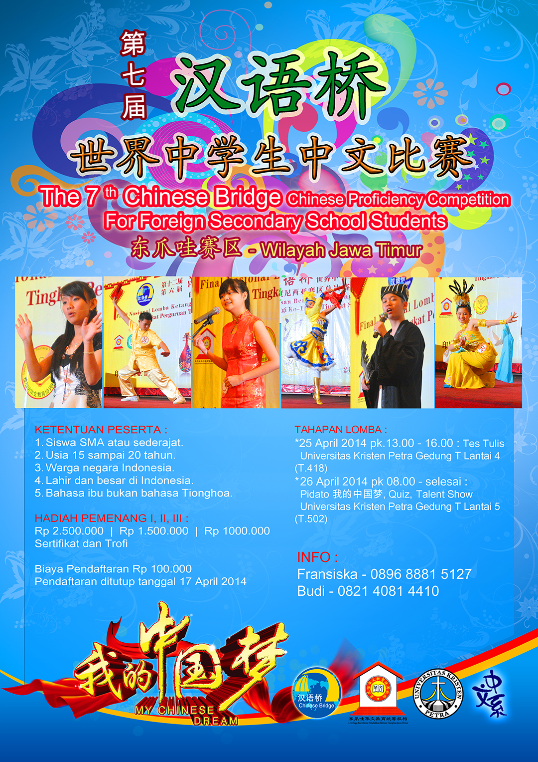 Prodi Sastra Tionghoa menyelenggarakan kegiatan dengan tema “The 7th Chinese Bridge Chinese Proficiency Competition For Foreign Secondary School Student”. Kegiatan tersebut dibuka untuk siswa SMA atau sederajat dengan usia 15-20 tahun, berkewarganegaraan Indonesia, Lahir dan besar di Indonesia, serta bahasa ibu bukan bahasa tionghoa. Kegiatan berlangsung pada tanggal 25 -26 April 2014. Pemenanang akan mendapatkan hadiah sejumlah uang tunai, sertifikat dan trofi. Untuk informasi lebih lanjut dapat menghubungi Fransiska (089688815127) atau Budi (082140814410).