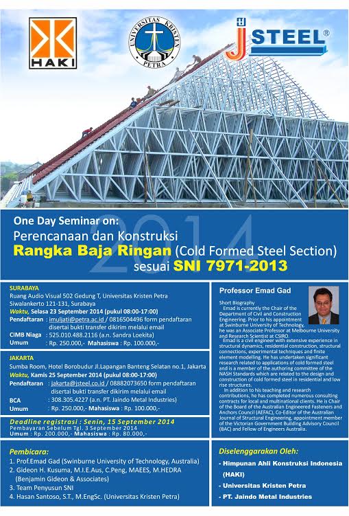 Prodi Teknik Sipil UK Petra menyelenggarakan One Day Seminar dengan tema “Perencanaan dan Konstruksi Rangka Baja RIngan (Cold ormed Steel Section) sesuai SNI 7971-2013. Dalam kegiatan tersebut menghadirkan Professor Emad Gad, Gideon H. Kusuma,M.I.E.Aus, C.Peng, MAEES, M.HEDRA, Team Penyusun SNI, dan Hasan Santoso,S.T., M.EngSc. sebagai pembicara. Pendaftaran dilaksanakan pada hari Senin, 15 September 2014 dengan biaya Rp 200.000 untuk umum dan Rp 80.000 untuk mahasiswa.