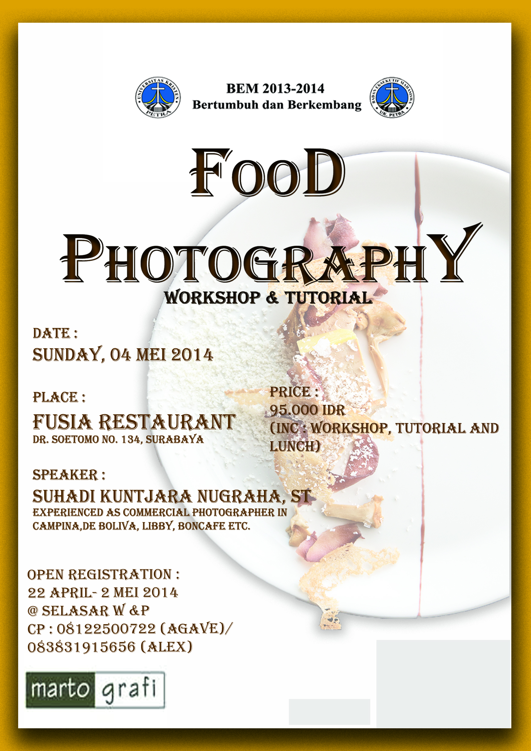 UKM Martografi UK Petra mengadakan workshop dan tutorial Food Photography. Kegiatan dilaksanakan pada hari Senin, 4 Mei 2014 bertempat di Fusia Restauran (Dr.Soetomo no. 134, Surabaya), dengan pembicara Suhadi Kuntjara Nugraham,ST.