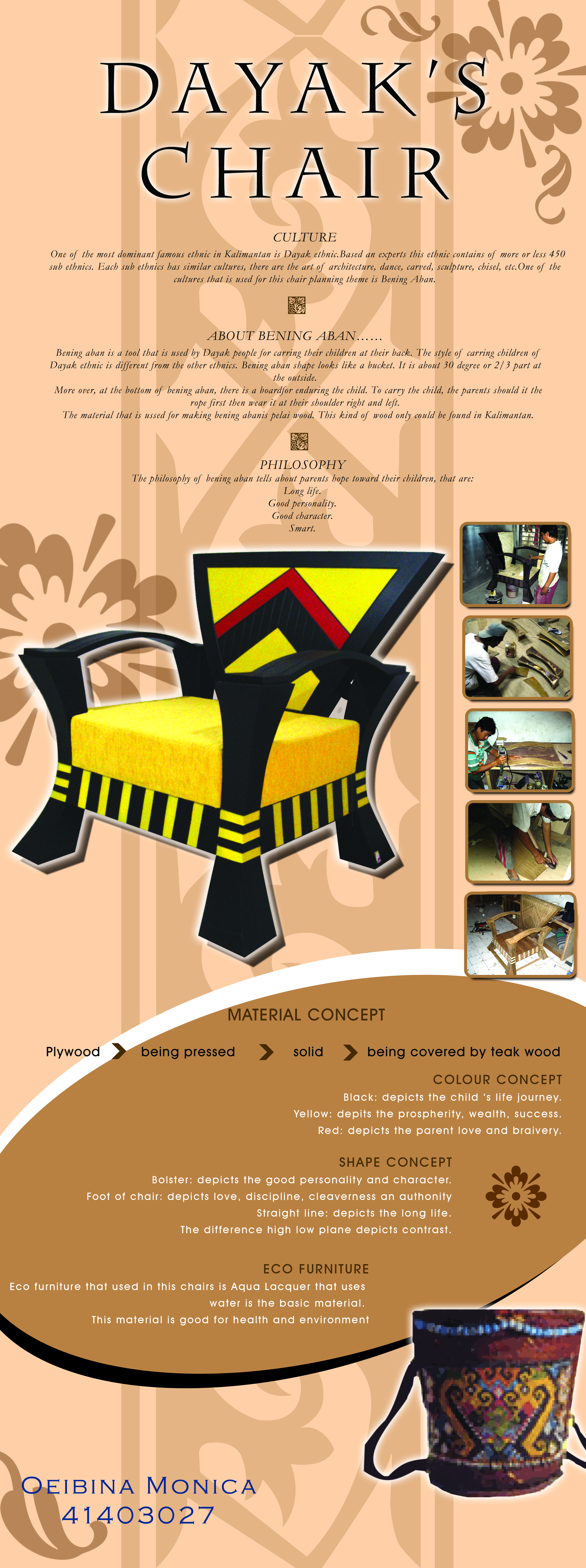 One of the most dominant famous ethnic in Kalimantan is Dayak ethnic. Based an experts this ethnic contains of more or less 450 sub ethnics. Each sub ethnics has similar cultures, there are the art of architecture, dance, carved, sculpture, chisel, etc. On of the cultures that is used for this chair planning theme is Bening Aban. Bening Aban is a tool that is used by Dayak people for carring their children at their back. The style of carring children of Dayak ethnic is different from the other ethnics. Bening aban shape looks like a bucket. It is about 30 degree or 2/3 part at the outside. More over, at the bottom of bening aban, there is a board for enduring the child. To carry the child, the parents should it the rope first then wear it at their shoulder right and left. The material that is ussed for making bening abanis pelay wood. This kind of wood only could be found in Kalimantan. The philosophy of bening aban tells about parents hope toward their children, that are: long life, good personality, good character, and smart.