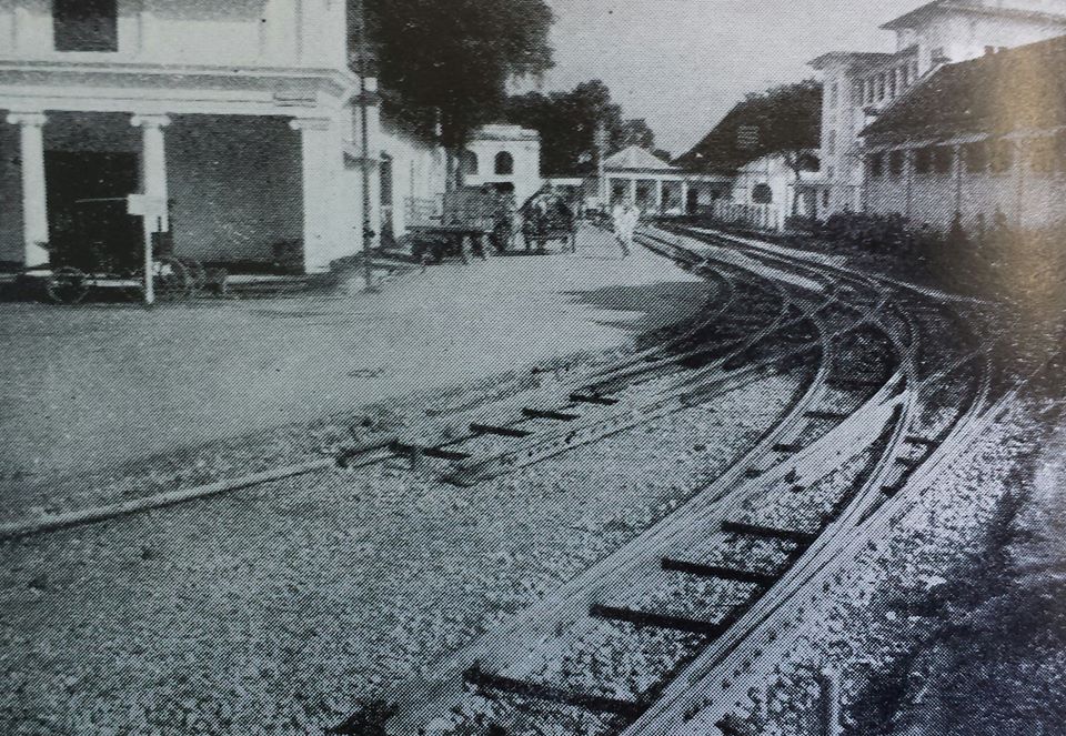 Trek tram listrik di willemplein. Sebelah kanan tampak gedung Kantor