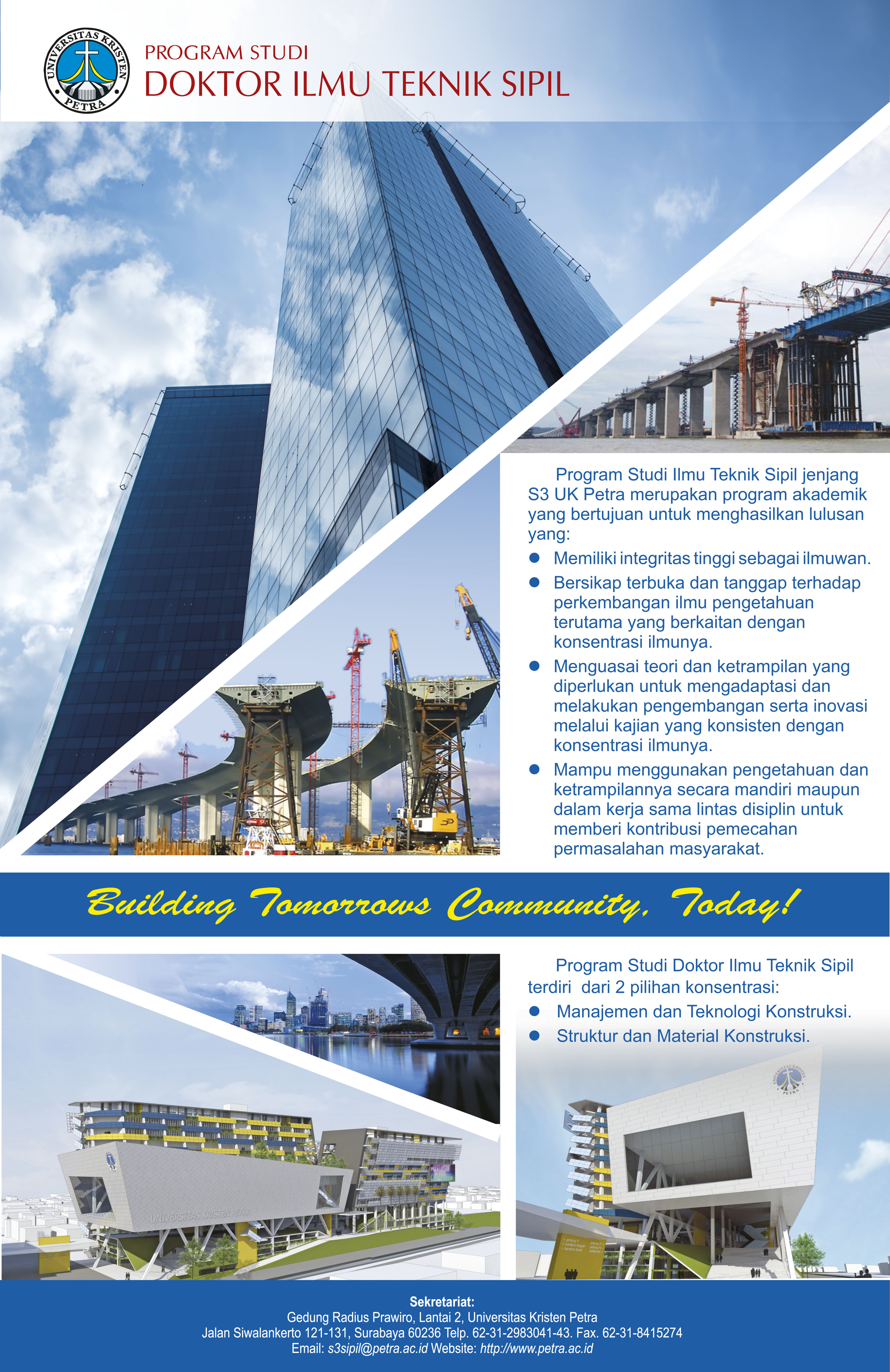Program Studi Doktor ilmu teknik sipil UK Petra membuka pendaftaran mahasiswa baru, dengan 2 pilihan konsentrasi studi yaitu Manejemen dan Teknologi Konstruksi, Struktur dan Material Konstyruksi. Informasi lebih lanjut bisa dilihat di www.petra.ac.id