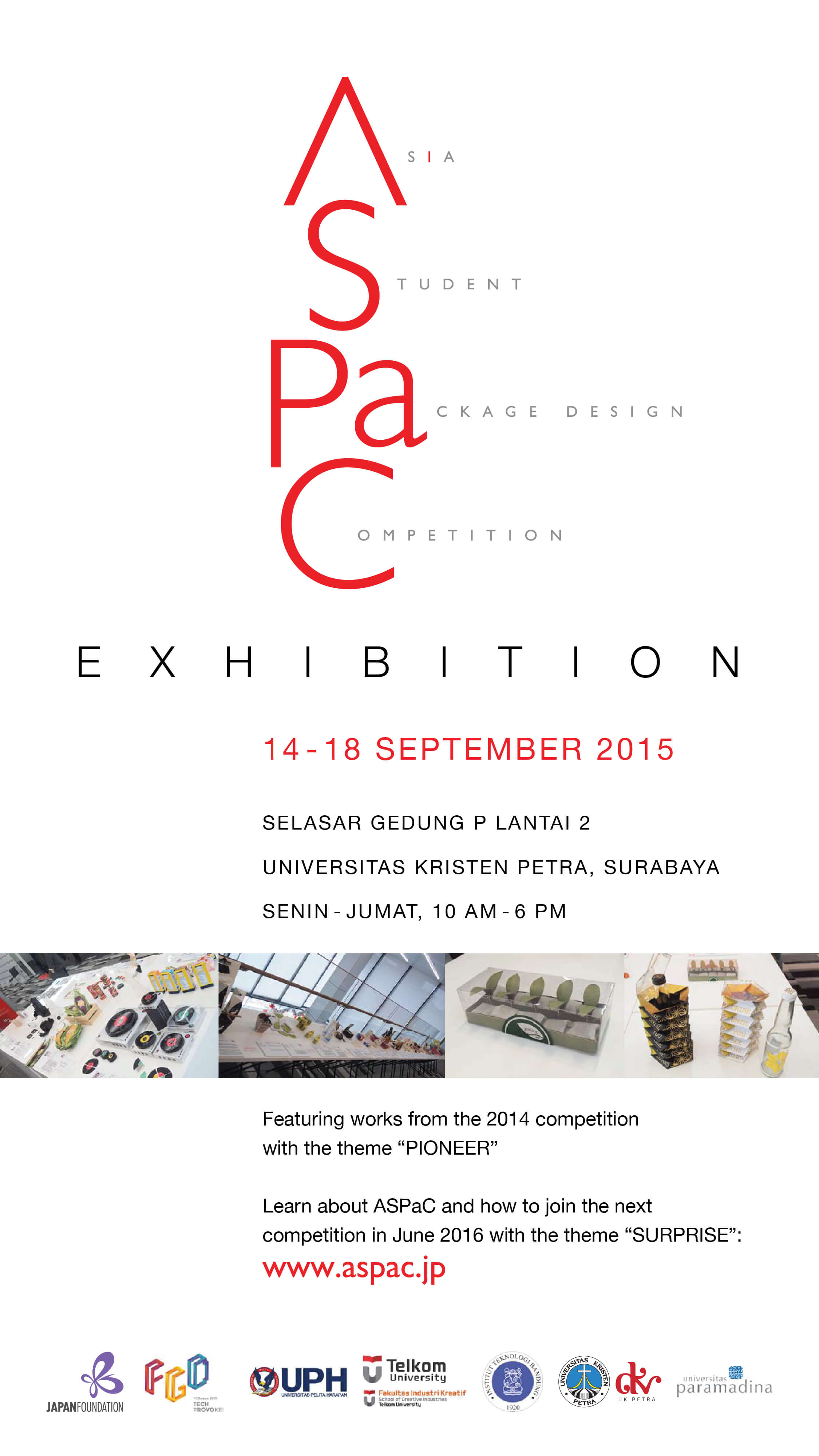 ASPAC Exhibition atau Asia Student Package Design Competition merupakan kegiatan yang diselenggarakan oleh Prodi Desain Komunikasi Visual UK Petra. Kegiatan dilaksanakan pada hari Senin-Jumat pada puul 10.00-18.00 bertempat di Selasar Gedung P lantai 2.