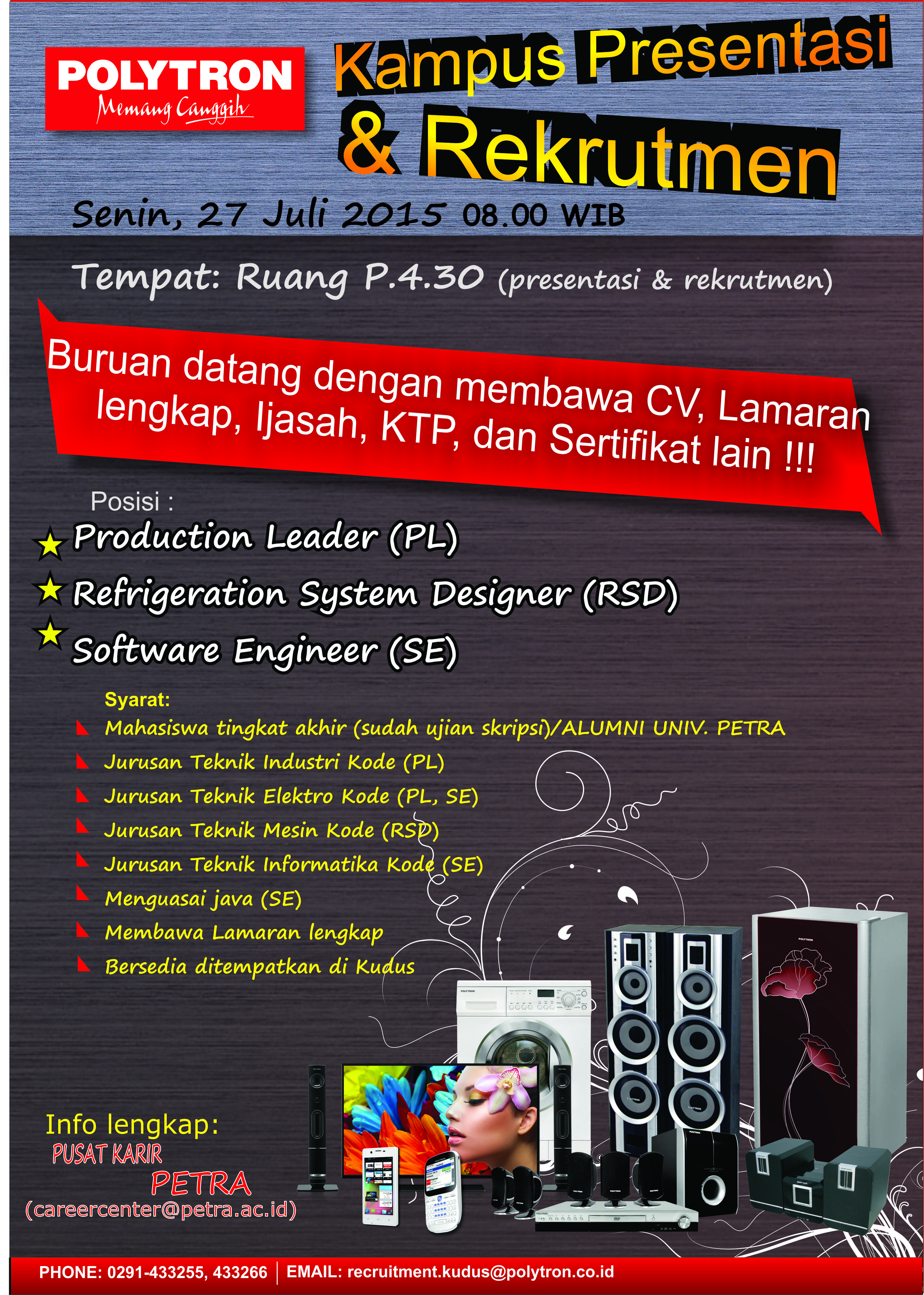 Kampus presentasi & rekrutmen bersama Polytron. Kegiatan diselenggrakan pada hari Senin, 27 Juli 2015 pada pukul 08.00 WIB bertempat di Gedung P ruang P430. Polytron membutuhkan tenaga kerja diposisi production leader (PL), refrigiration system designer (RSD), dan software engineer (SE). Informasi lengkap dapat mengunjungi Pusat Karir Petra.