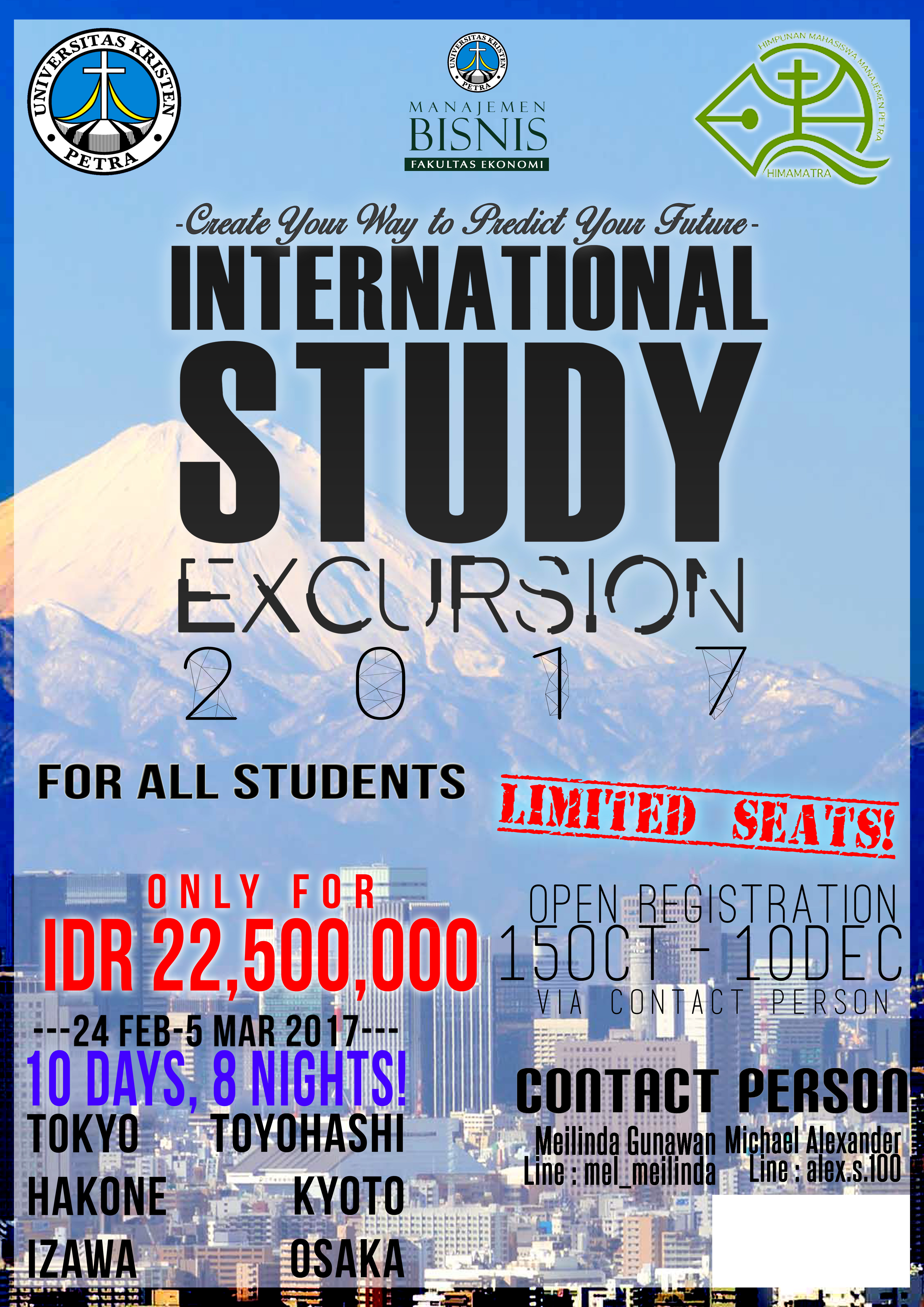 Program Manajemen Bisnis UK Petra mengadakan studi ekskursi ke daerah Jepang pada tanggal 24 Februari hingga 05 Maret 2017. Pendaftaran dibuka hingga 10 Desember 2016, dengan biaya Rp. 22.500.000.