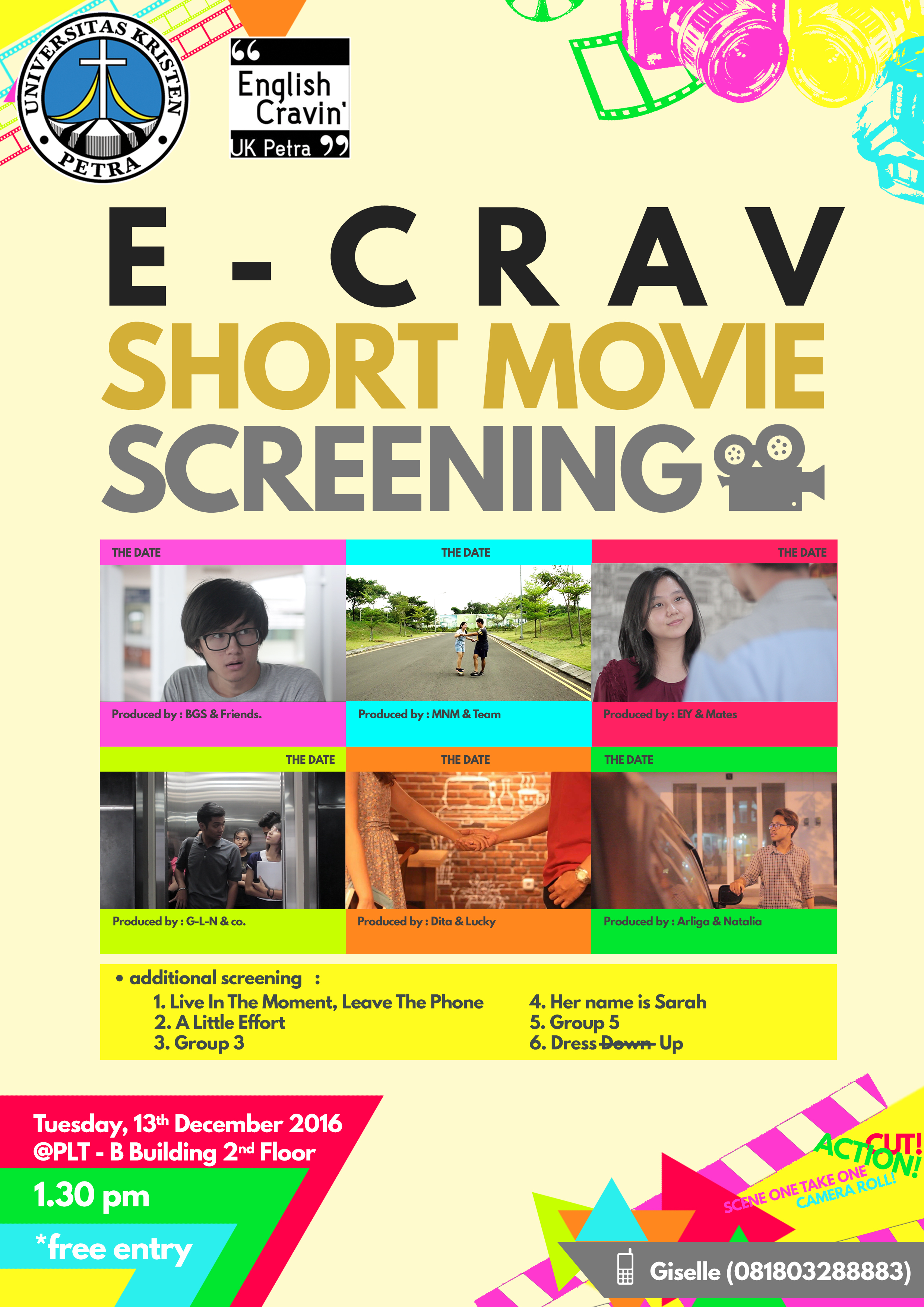 Jurusan Sastra Inggris UK Petra mengadakan seleksi tentang film pendek. Acara yang mengangkat tema E-Crav short movie screenign ini diadakan pada 13 Desember 2016 bertempat di ruang PLT gedung B.lantai 2.