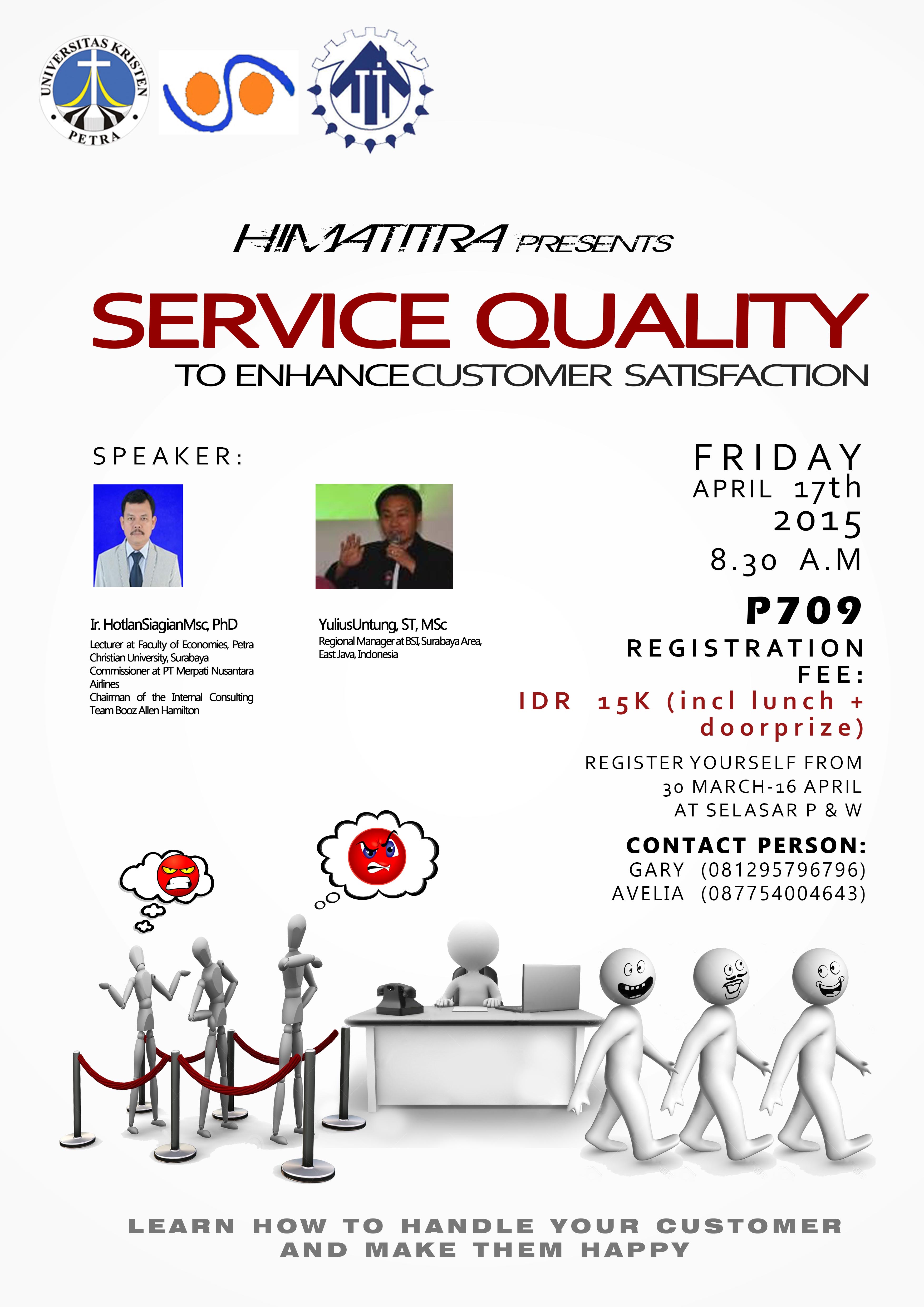 HIMATITRA UK Petra menyelenggarakan Seminar dengan tema “Service Quality to Enhance Customer Satisfaction”. Kegiatan dilaksanakan pada hari Jumat, 17 April 2015 pada pukul 8.30 WIB bertempat di P709. Seminar ini menghadirkan Ir. Hotlan Siagian M.Sc., Ph.D. dan Yulius Untung, S.T., M.Sc. sebagai pembicara. Pendaftaran kegiatan dibuka pada tanggal 30 Maret – 16 April di selasar P dan W, dengan biaya sebesar Rp 15.000 (gratis makan siang).