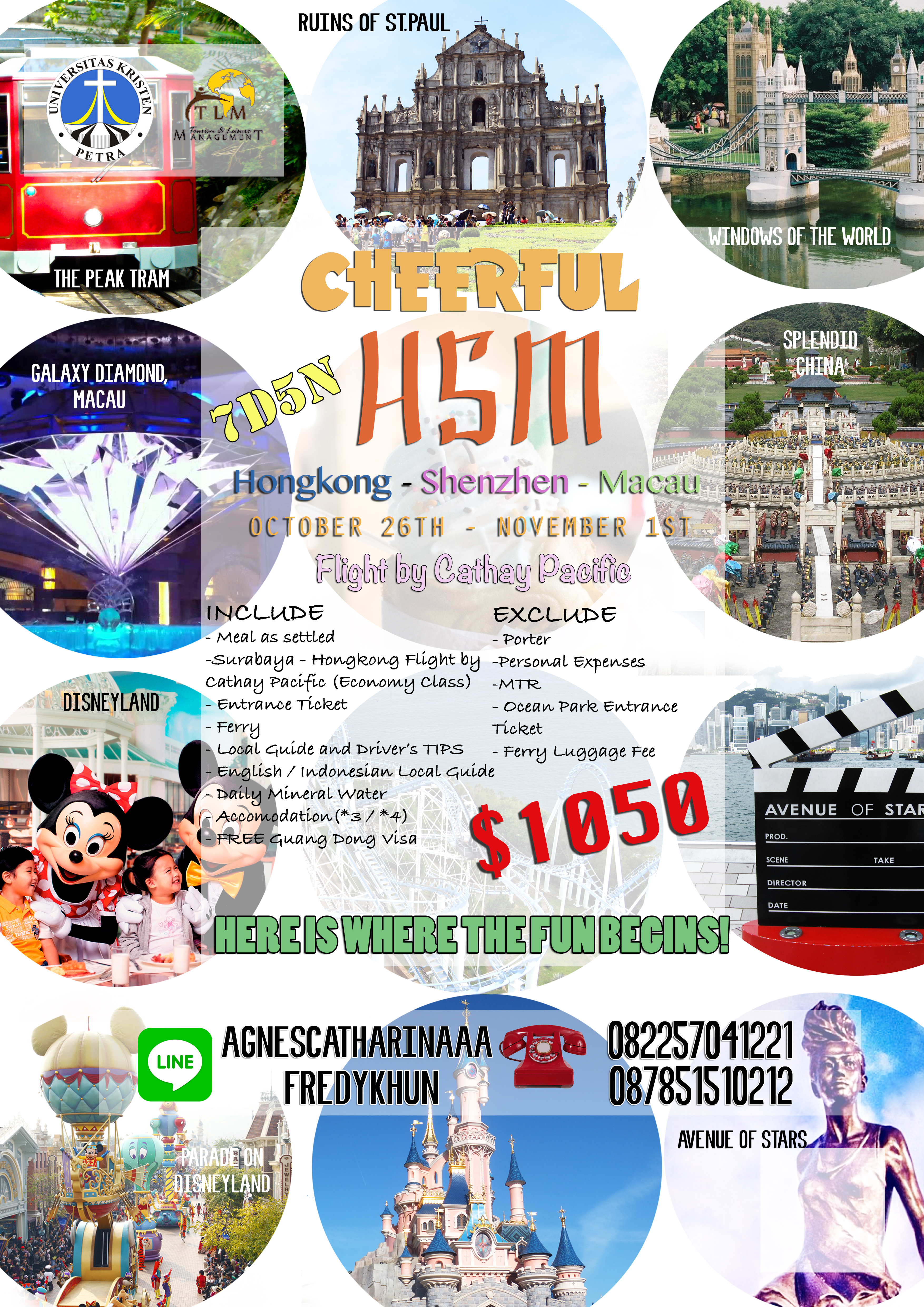 Cheerful HSM, Hongkong – Shenzhen – Macau, adalah kegiatan tur rutin yang diselenggarakan oleh Program Studi Manajemen Pariwisata. Kegiatan tersebut dilaksanakan pada tanggal 26 Oktober – 1 November. Bagi mahasiswa yang ingin bergabung dalam kegiatan tur tersebut, dapat melakukan pendaftaran dan membayar biaya tur sebesar $1050.