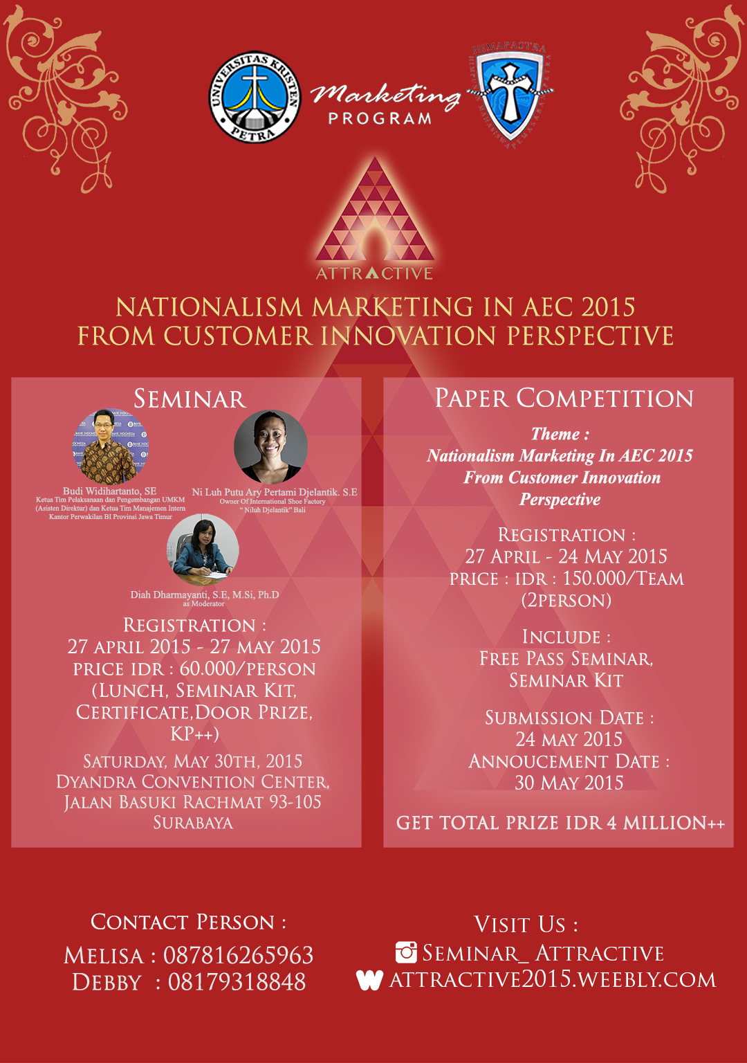 Program Studi Manajemen Pemasaran UK Petra, mengadakan kegiatan seminar nasional dengan tema “Nationalism Marketing in AEC 2015 From Customer Innovation Perspective”. Kegiatan dilaksanakan pada 30 Mei 2015. Bagi mahasiswa yang berminat dapat melakukan pendaftaran pada tanggal 27 April 2015 – 27 Mei 2015 dengan membayar sebesar Rp 60.000/orang. Seminar tersebut juga menghadirkan Budi Widihartanto,SE dan Ni Luh Putu Ary Pertami Djelantik. S.E sebagai pembicara,dan Diah Dharmayanti, S.E,M.Si sebagai moderator. Selain mengadakan kegiatan seminar, kegiatan ini juga menyelenggarakan lomba karya ilmiah, bagi mahasiswa yang berminat dapat melakukan pendaftaran dan membayar sebesar Rp 150.000/ team (2 orang).
