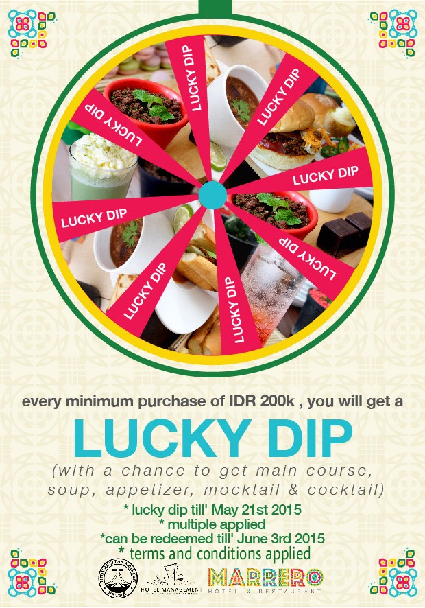 Setiap pembelian Rp 200.000, konsumen Marrero berhak mendapatkan kesempatan “Lucky Dip”, yaitu kesempatan mendapatkan main course, mocktail & cocktail, soup, dan appetizer. Marrero 7 > Cobalah menu tambahan baru Marrero pada pukul 09.30-17.00. menu baru tersebut yaitu French toast dan Open Sandwich.