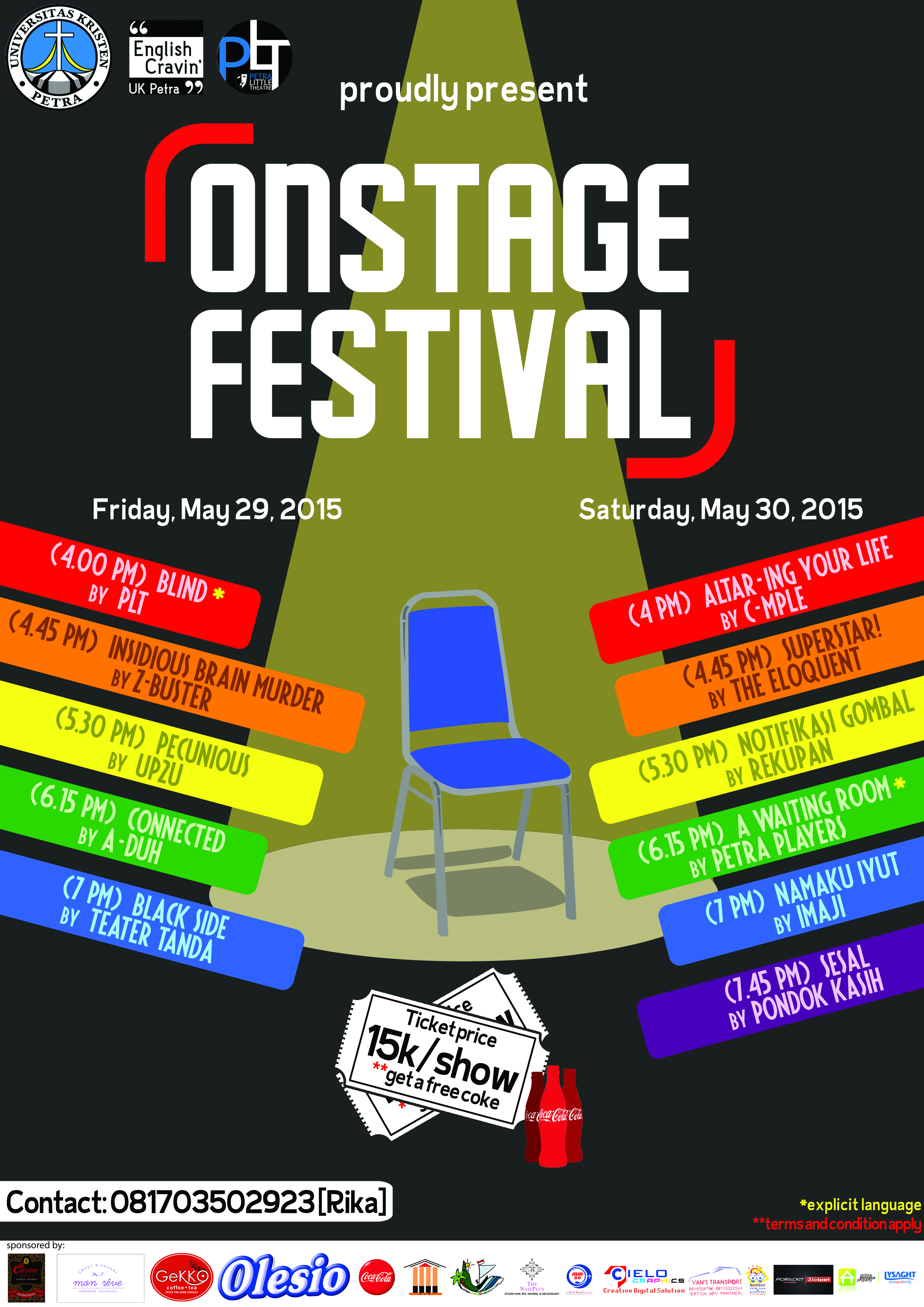Petra Little Theatre mempersembahkan Onstage Festival yang diselenggarakan pada 29 - 30 Mei 2015. Kegiatan yang diselenggarakan selama 2 hari itu, dimeriahkan oleh beberapa susunan acara seperti Blind by PLT, Insidious Brain Murder by Z-Buster, Namaku Iyut by Imaji, dan masih banyak lagi. Tiket untuk pertunjukan teater tersebut dibandrol seharga Rp 15.000