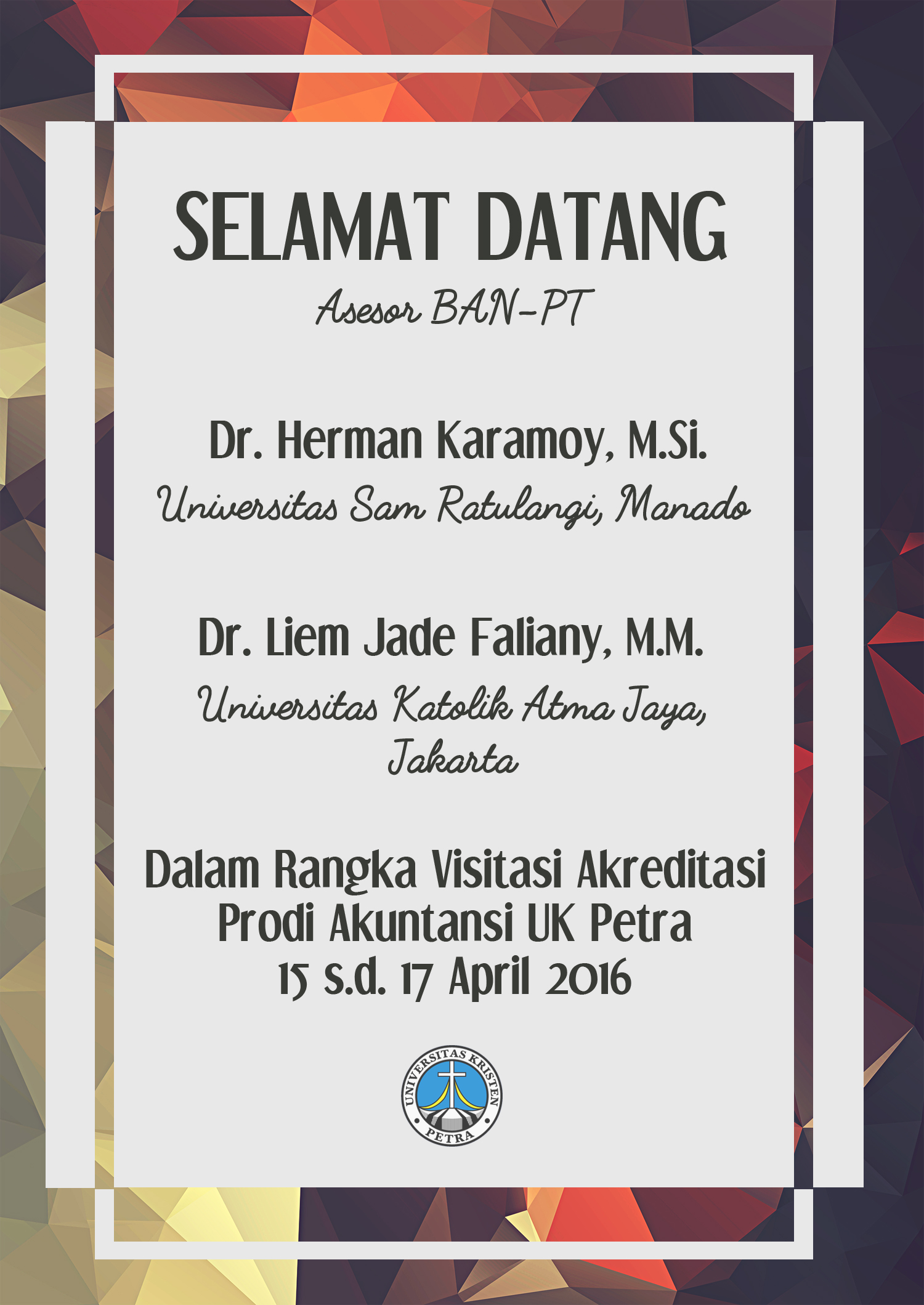 Ucapan selamat datang ditujukan kepada bapak Dr. Herman Karamoy M.Si. dan ibu Dr. Liem Jade Faliany M.M. selaku tim asesor BAN-PT di program studi Akuntansi Universitas Kristen Petra Surabaya pada tanggal 15-17 April 2016