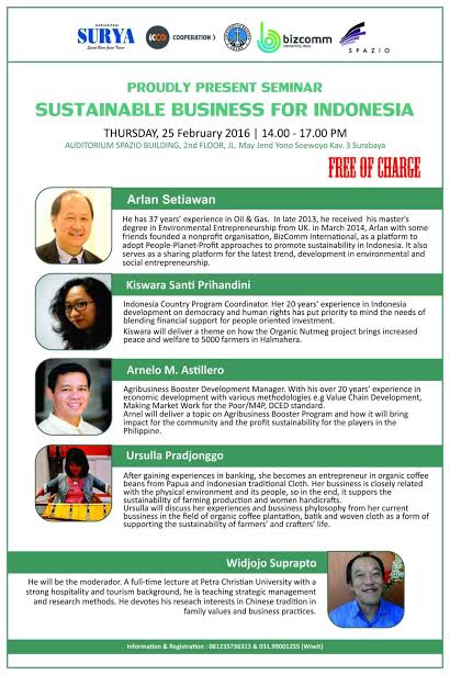 Progrm studi manajemen bisnis UK Petra Surabaya mengadakan acara, Proudly Present Seminar dengan tema Sustainable Business for Indonesia. Acara ini diselenggarakan, 25 Februari 2016 di Auditorium Spazio Building lantai 2 Surabaya. Menghadirkan pembicara Arlan Setiawan, Kisweara Santi Prihandini, Arnelo M. Astillero, Ursulla Pradjonggo. Dengan moderator Widjojo Suprapto.
