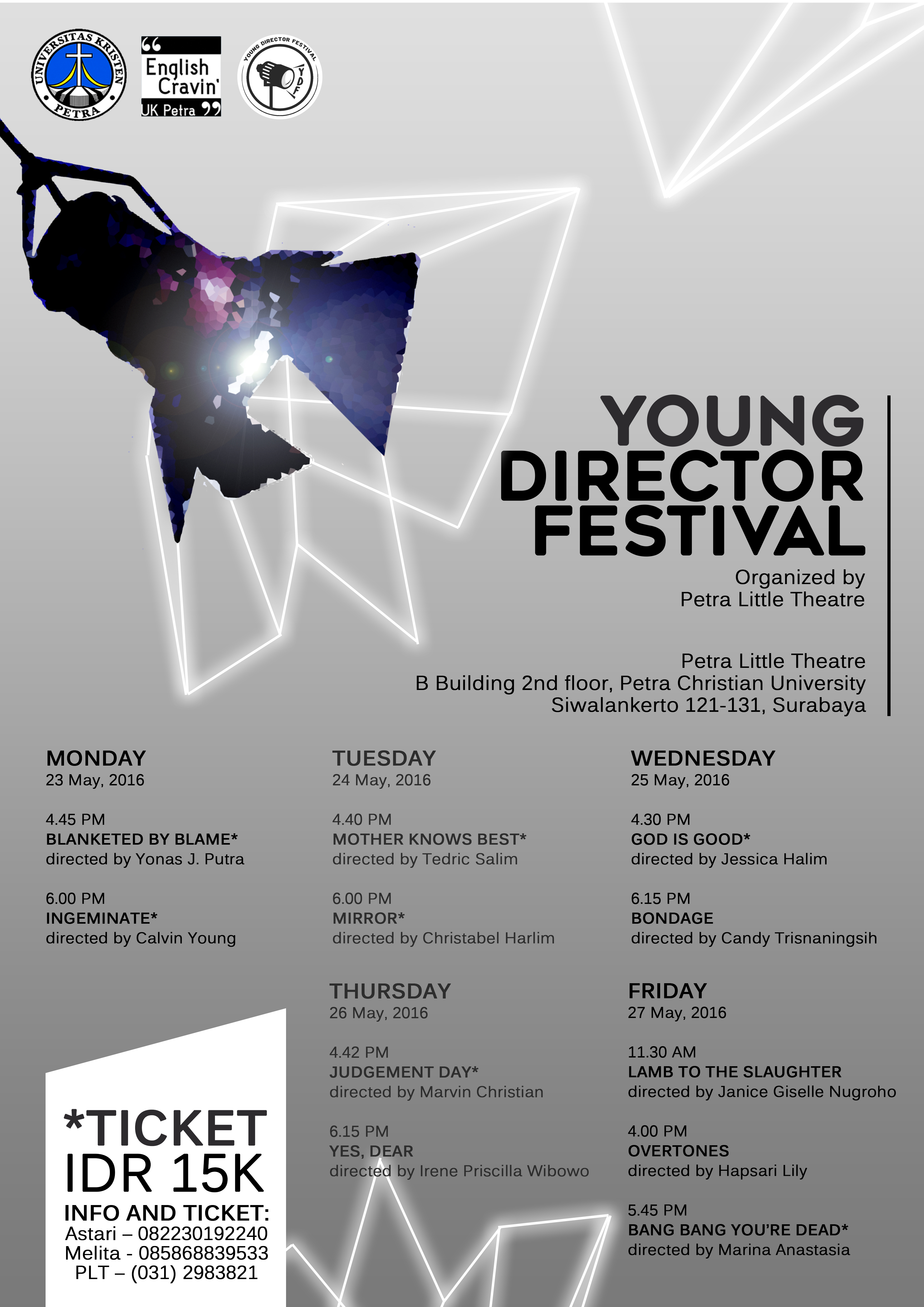 Petra Little Theater mengadakan pentas drama dengan topik " Young director festival", dilaksanakan pada 23-27 Mei 2016 bertempat di gedung B lantai 2 Universitas Kristen Petra Surabaya.