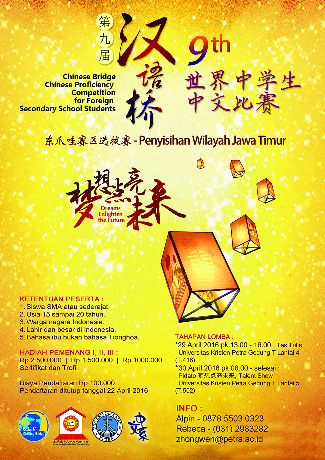 Sastra Tionghoa Universitas Kristen Petra mengadakan kompetisi untuk wilayah Jawa Timur dan untuk kalangan siswa SMA sederajat. Kompetisi bertema: "Chinese bridge Chinese proficiency competition for foreign secondary school students" dilaksanakan pada 29-30 April 2016 di kampus UK Petra.