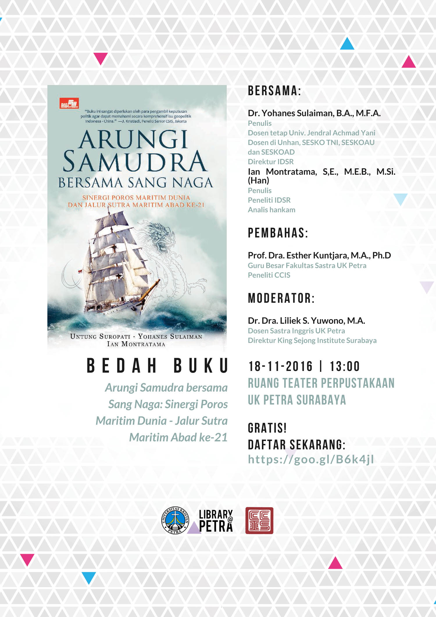 Perpustakaan Universitas Kristen Petra Surabaya mengadakan bedah buku yang berjudul "Arungi samudra bersama sang naga". Acara ini diselenggarakan pada 18 November 2016 di ruang Teater Perpustakaan.
