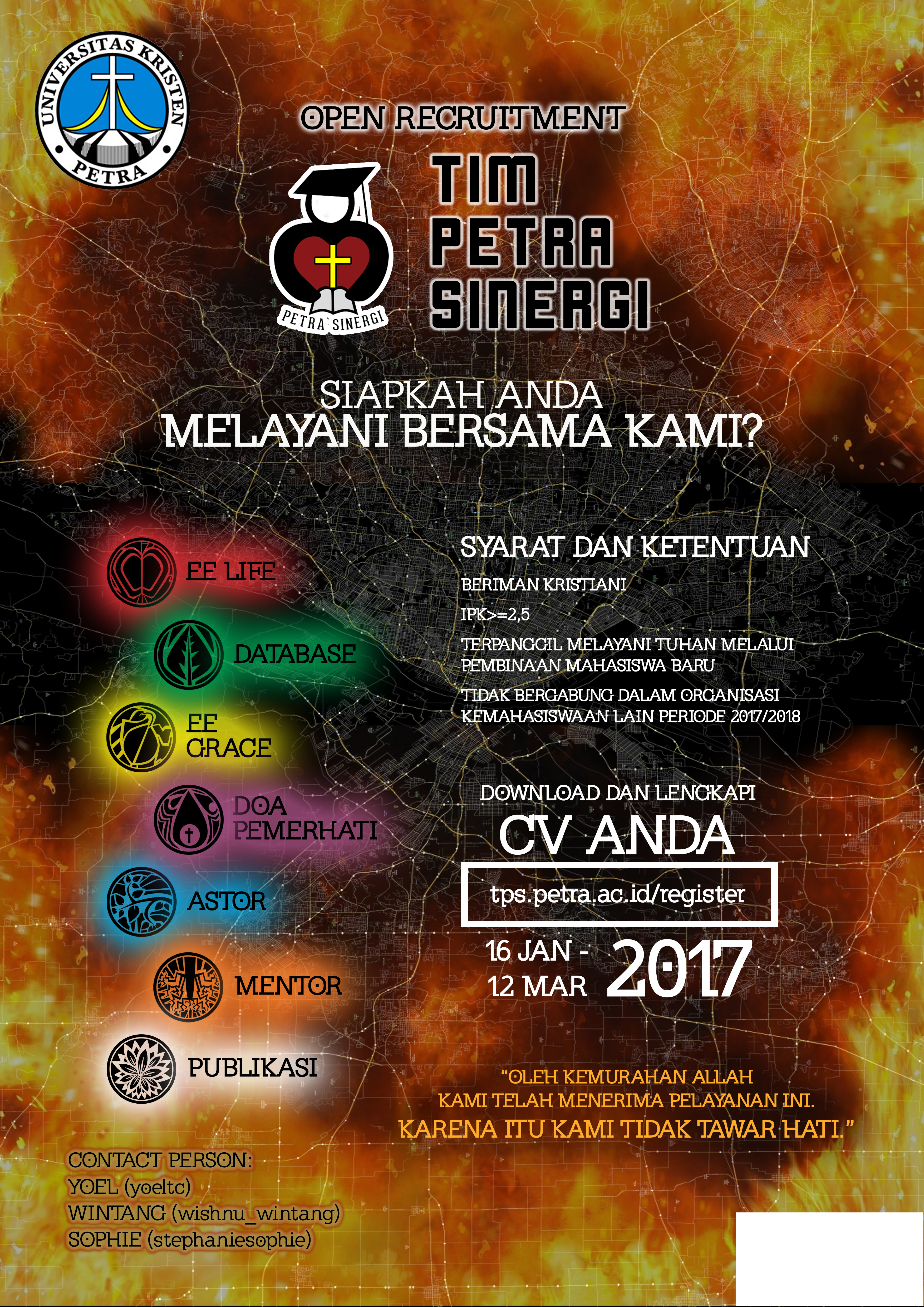 Tim Petra Sinergy membuka kesempatan bagi mahasiswa UK Petra untuk bergabung dalam kepanitian Tim Petra Sinergy. Pendaftaran dibuka dari tanggal 16 Januari hingga 12 Maret 2017.