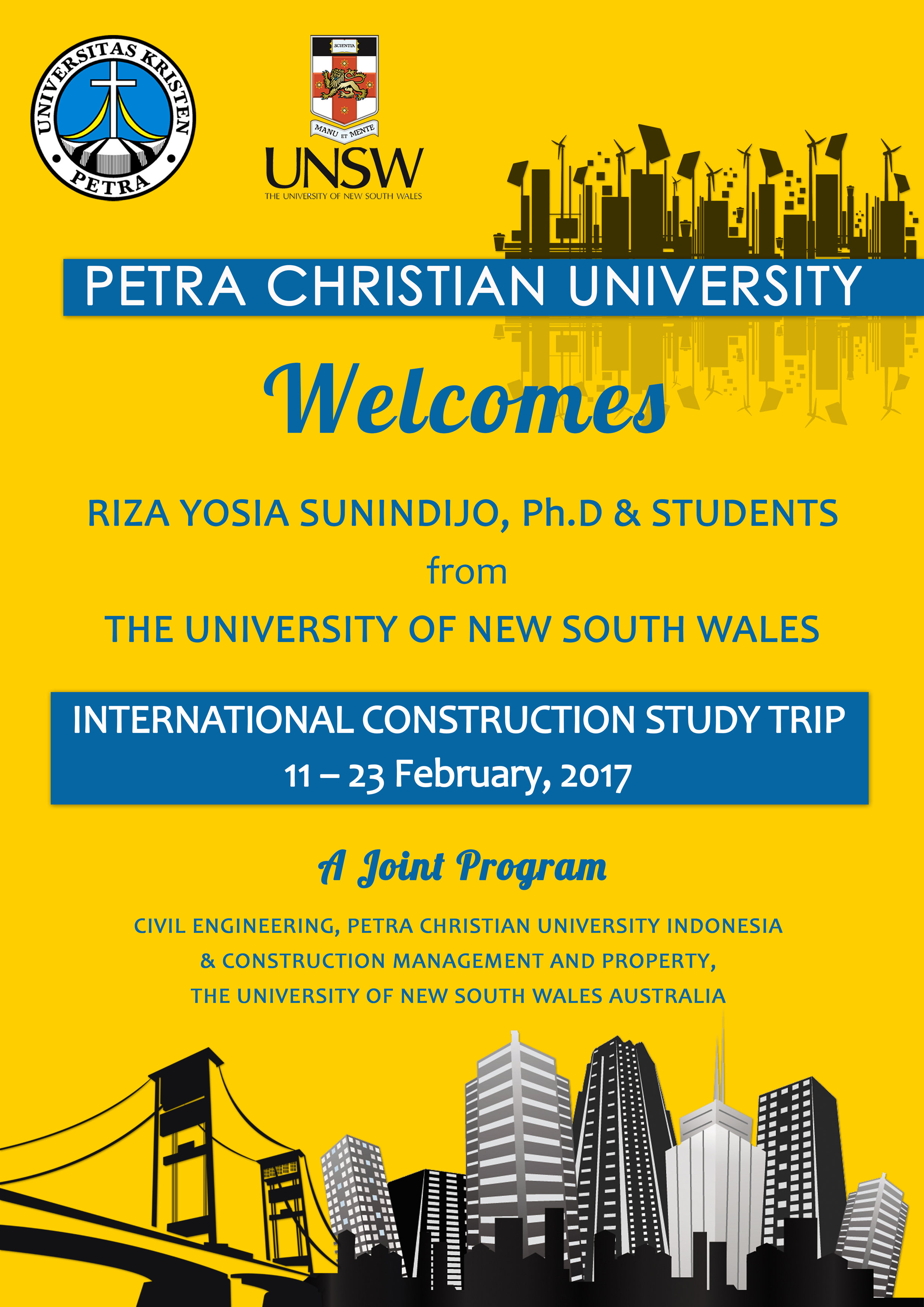 Dalam rangka kerjasama dengan The University of New South Wales Australia jurusan Construction Management and Property., Program study teknik Sipil UK Petra kedatangan tamu dari UNSW. Rombongan UNSW dipimpin oleh Riza Yosia Sunindijo, PhD. Kunjungan ini dilaksanakan pada 11-23 Februari 2017.