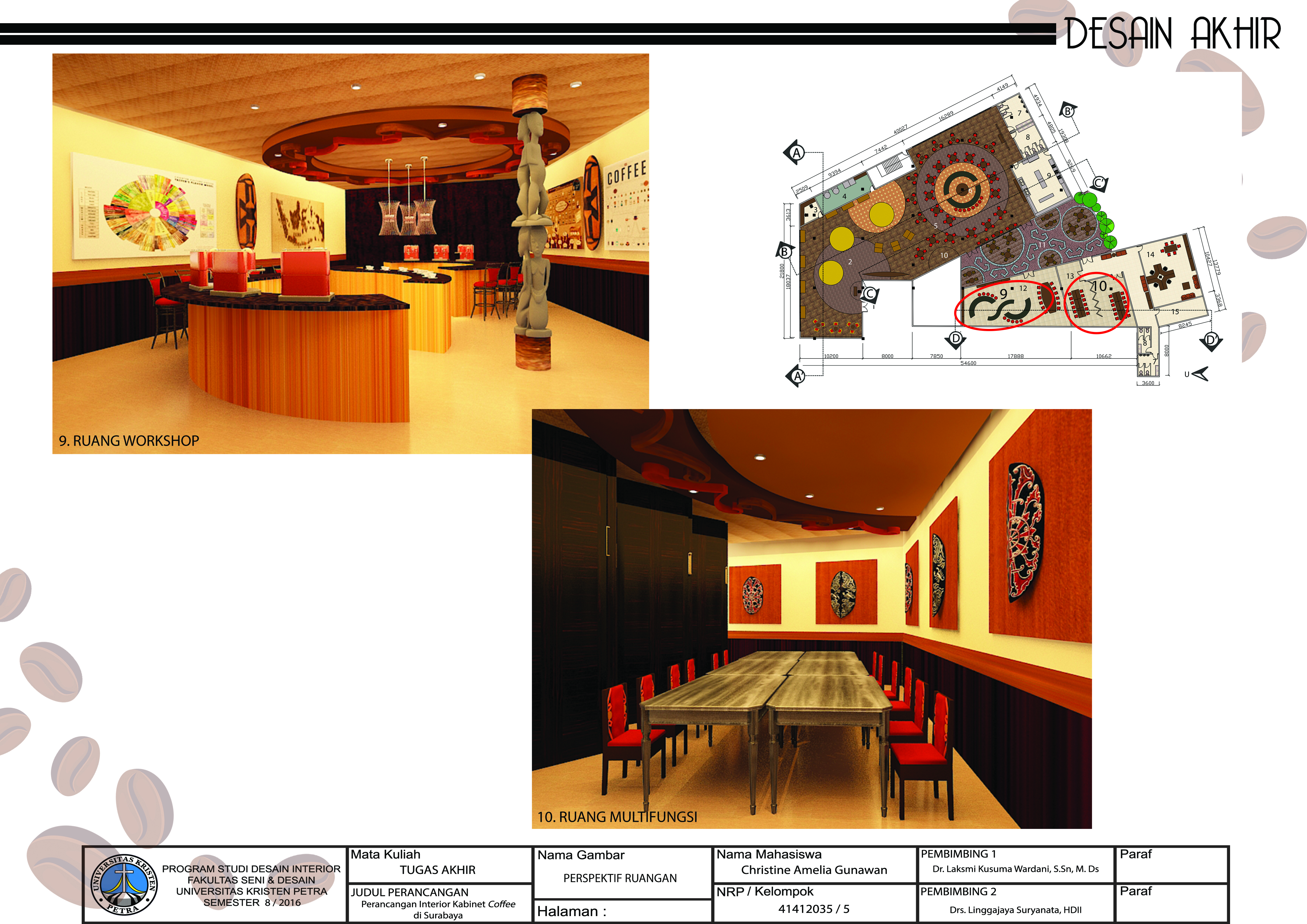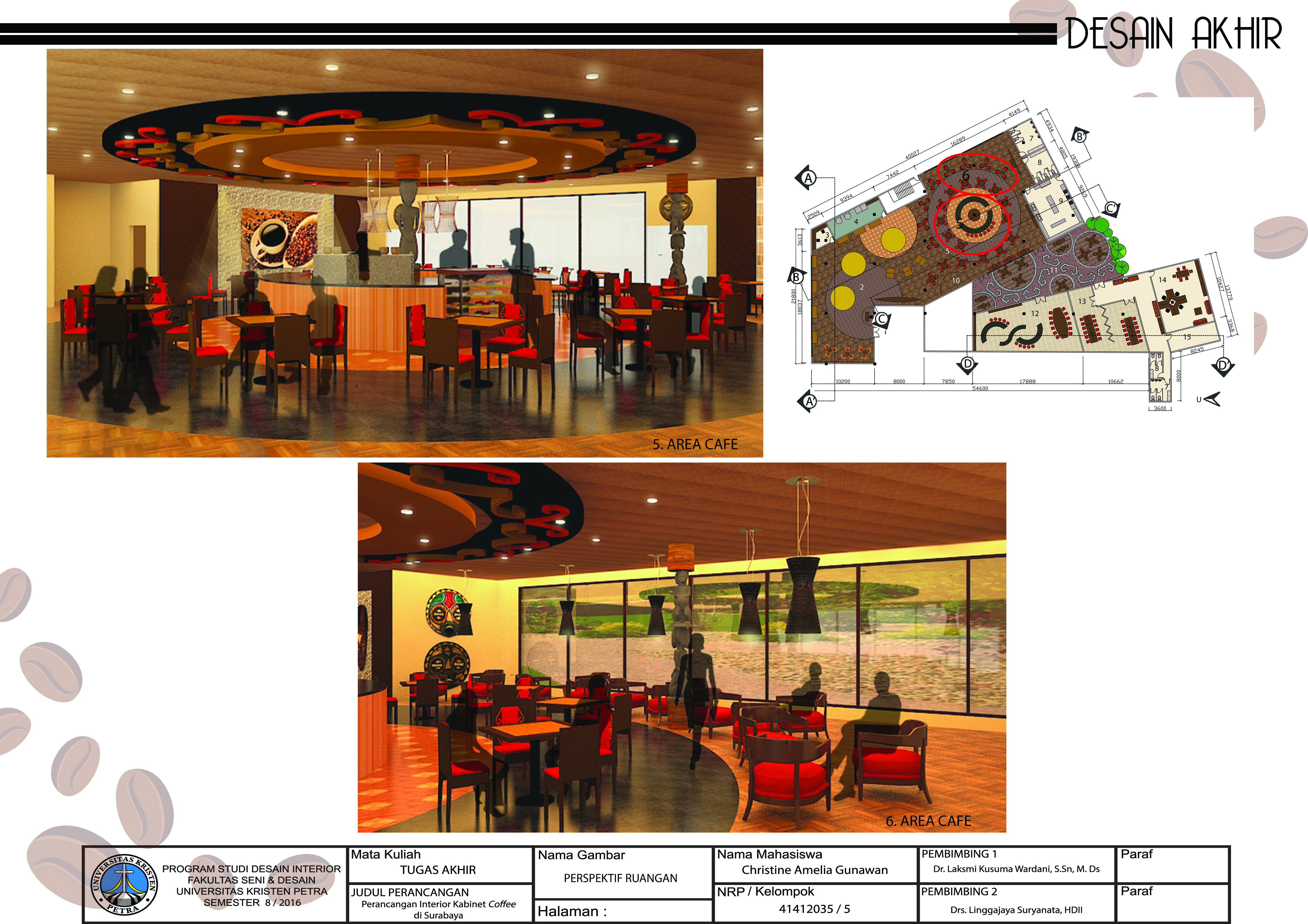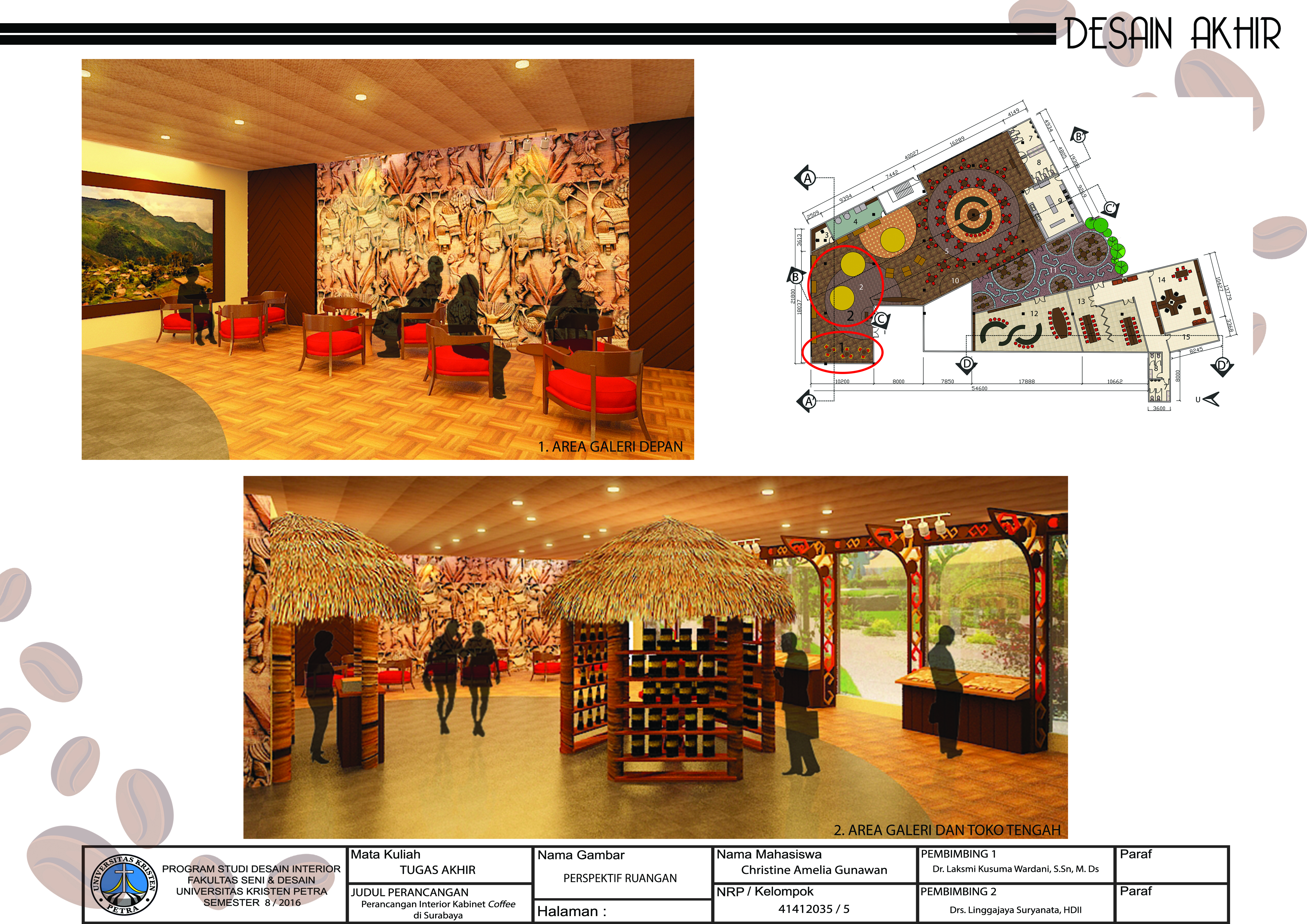 Kabinet Coffee merupakan coffee shop satu-satunya di Surabaya yang menyediakan informasi tentang kopi kepada pengunjungnya, tidak hanya bersifat komersial tetapi dapat menunjukkan beberapa informasi tentang kopi. Perancangan interior Kabinet Coffee ini bertujuan untuk menyediakan coffee center yang menjual minuman kopi dan makanan serta menyediakan fasilitas informasi tentang kopi Indonesia dengan membuka cabang dari Kabinet Coffee yang sudah ada. Fasilitas ruang yang disediakan adalah café, toko, galeri, ruang workshop, dan ruang multifungsi. Perancangan interior Kabinet Coffee ini terinspirasi oleh kopi spesialis dari Kabinet Coffee yaitu kopi Papua Wamena. Konsep yang diambil adalah bertema Papua yang digabungkan dengan unsur kopi. Konsep diterapkan pada elemen interior dengan mengambil elemen dari Suku Asmat yaitu tameng, topeng, patung, rumah adat, dan perahu, serta mengambil warna khas yaitu merah dan coklat. Sedangkan unsur kopi yang diambil adalah bentuk bulat dan warna coklat.