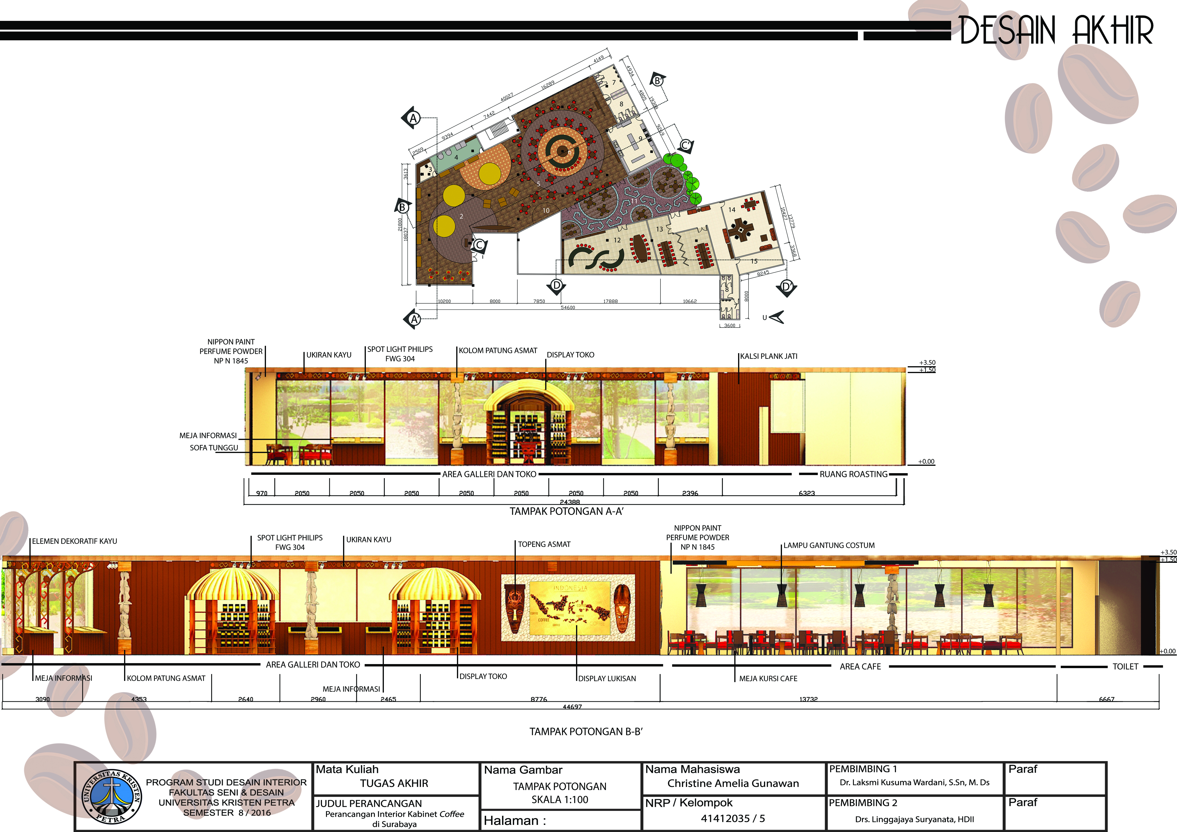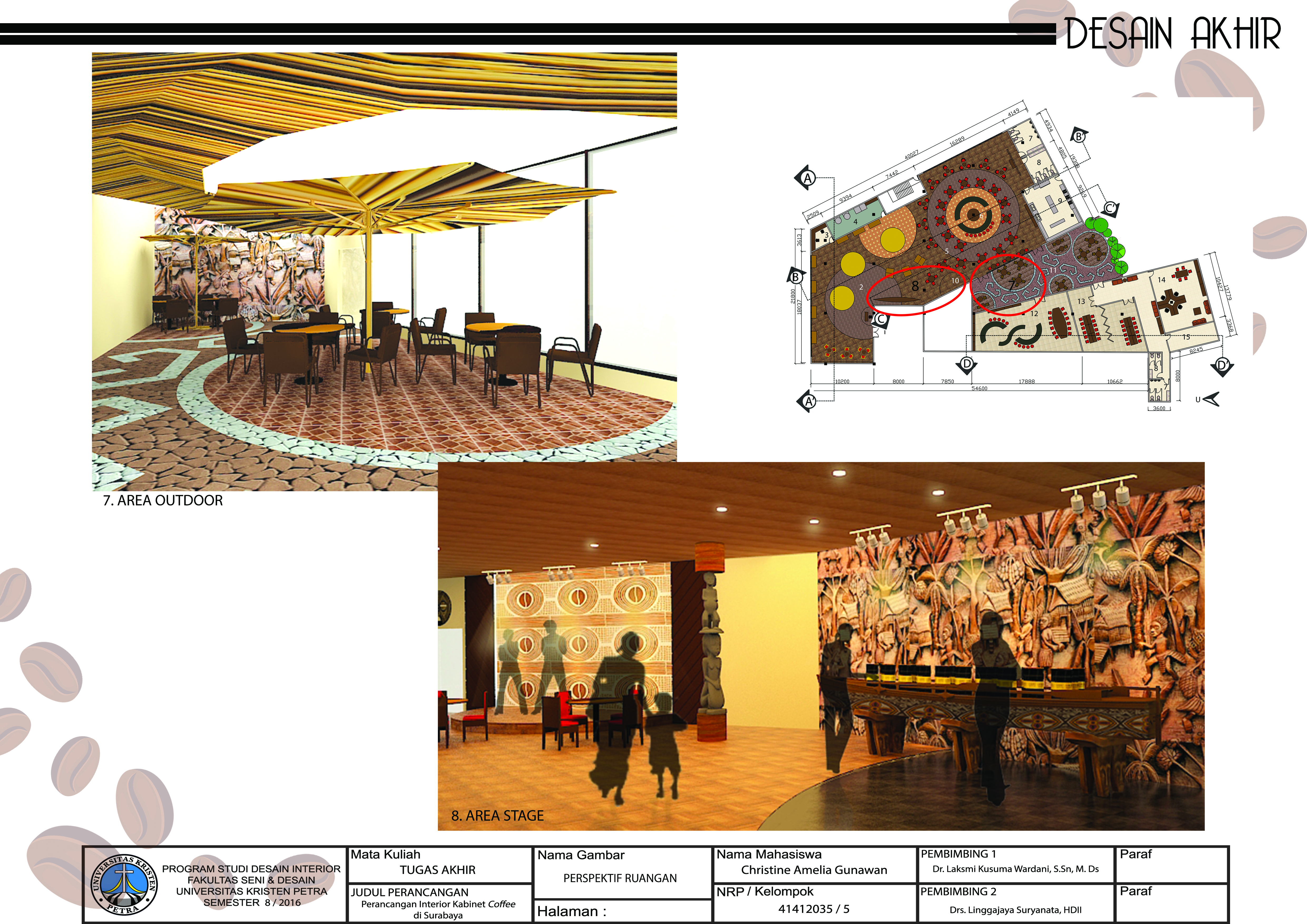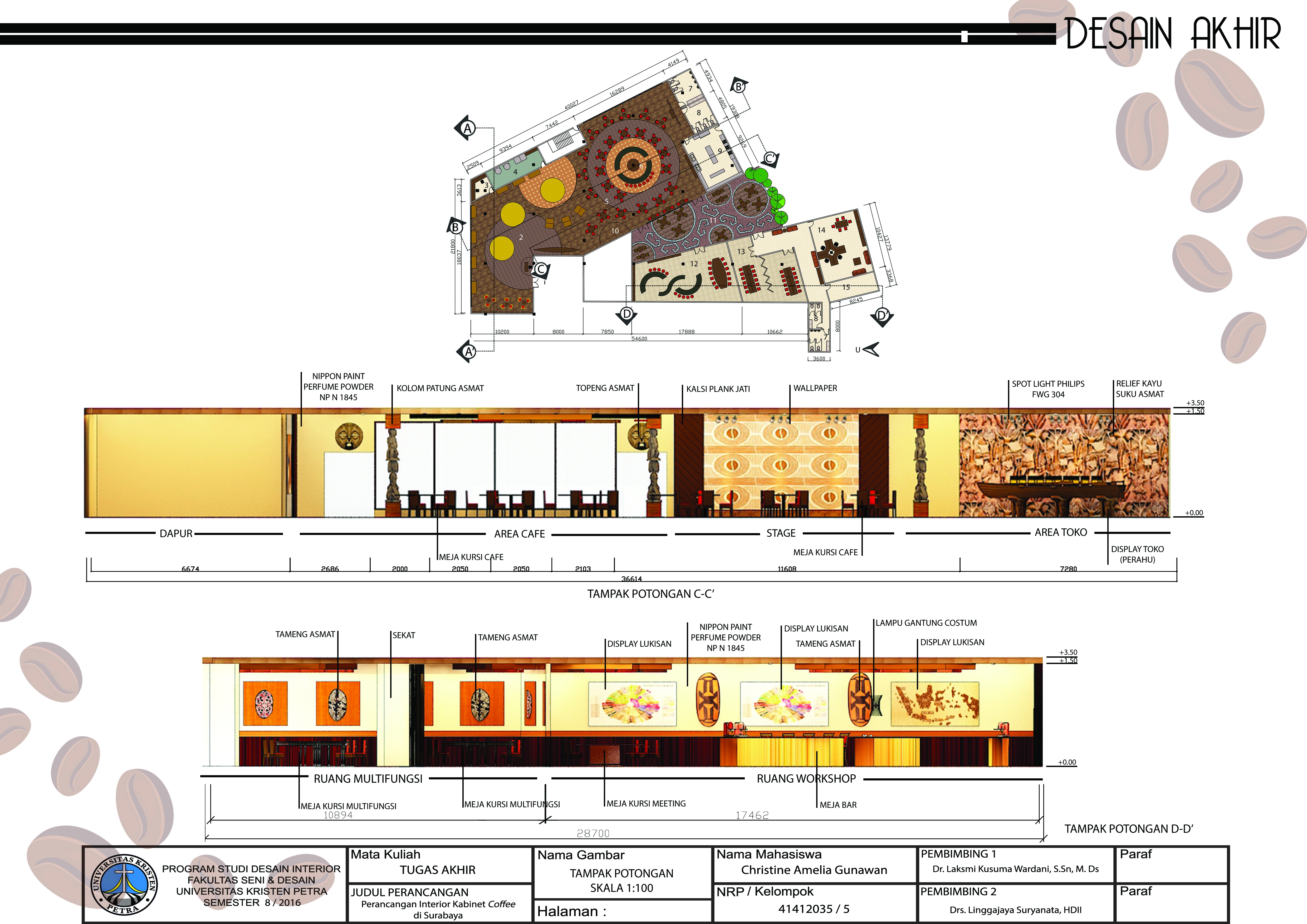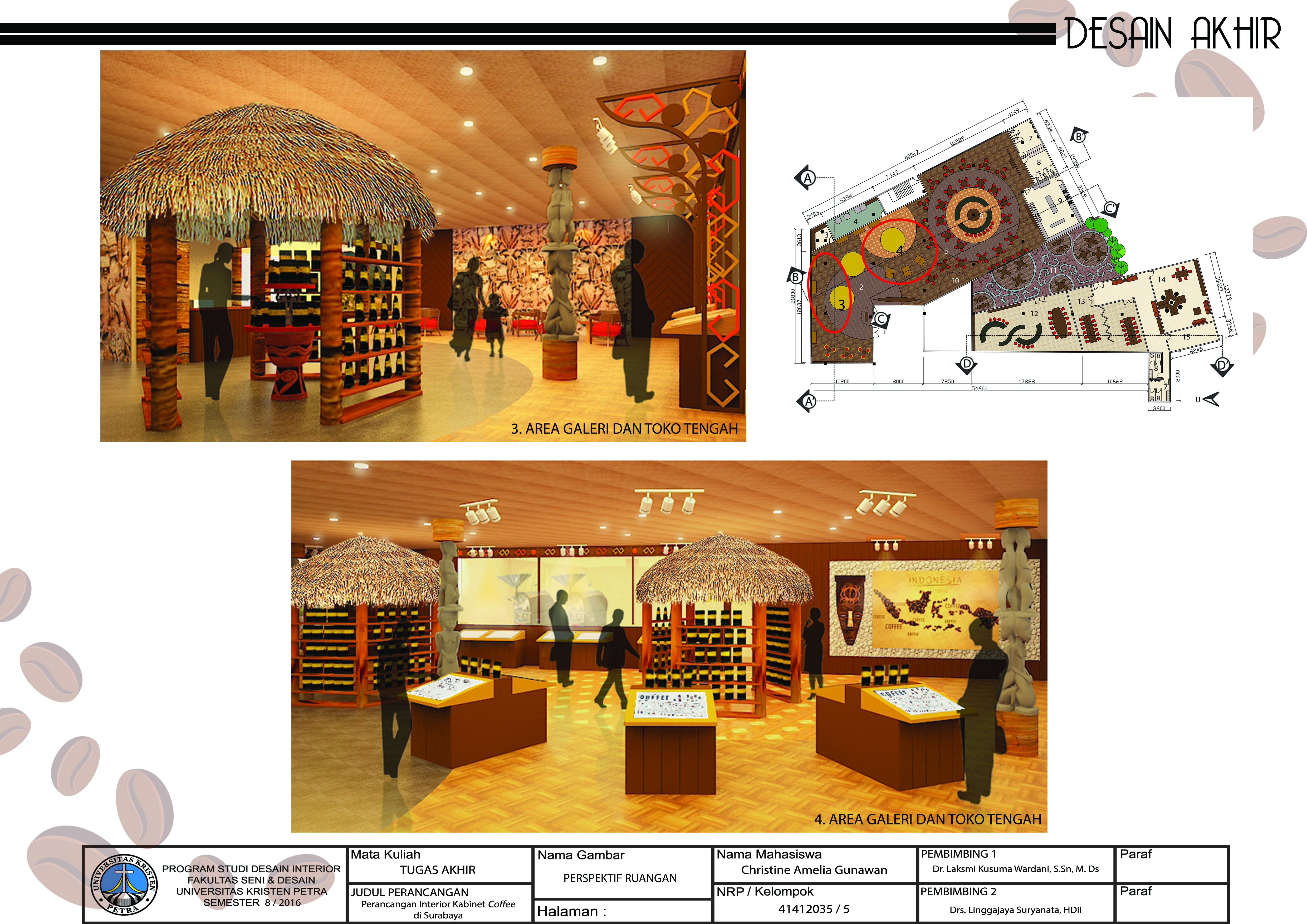 Kabinet Coffee merupakan coffee shop satu-satunya di Surabaya yang menyediakan informasi tentang kopi kepada pengunjungnya, tidak hanya bersifat komersial tetapi dapat menunjukkan beberapa informasi tentang kopi. Perancangan interior Kabinet Coffee ini bertujuan untuk menyediakan coffee center yang menjual minuman kopi dan makanan serta menyediakan fasilitas informasi tentang kopi Indonesia dengan membuka cabang dari Kabinet Coffee yang sudah ada. Fasilitas ruang yang disediakan adalah café, toko, galeri, ruang workshop, dan ruang multifungsi. Perancangan interior Kabinet Coffee ini terinspirasi oleh kopi spesialis dari Kabinet Coffee yaitu kopi Papua Wamena. Konsep yang diambil adalah bertema Papua yang digabungkan dengan unsur kopi. Konsep diterapkan pada elemen interior dengan mengambil elemen dari Suku Asmat yaitu tameng, topeng, patung, rumah adat, dan perahu, serta mengambil warna khas yaitu merah dan coklat. Sedangkan unsur kopi yang diambil adalah bentuk bulat dan warna coklat.